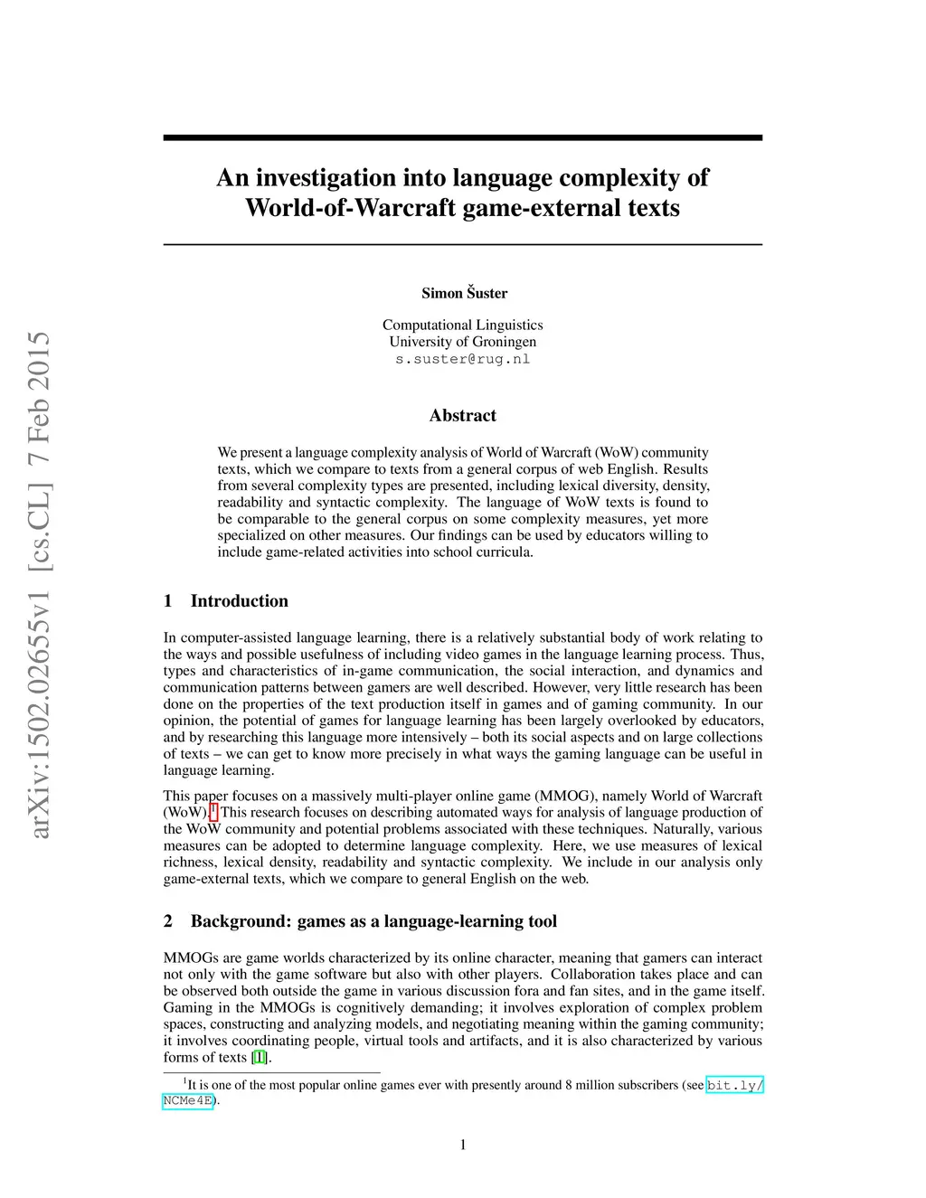 We present a language complexity analysis of World of Warcraft (WoW) community texts, which we compare to texts from a general corpus of web English. Results from several complexity types are presented, including lexical diversity, density, readability and syntactic complexity. The language of WoW texts is found to be comparable to the general corpus on some complexity measures, yet more specialized on other measures. Our findings can be used by educators willing to include game-related activities into school curricula.