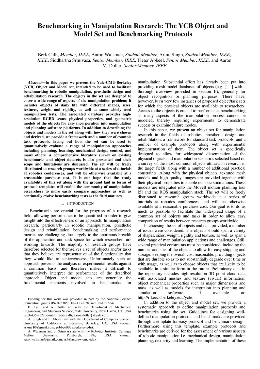 Benchmarking in Manipulation Research: The YCB Object and Model Set and