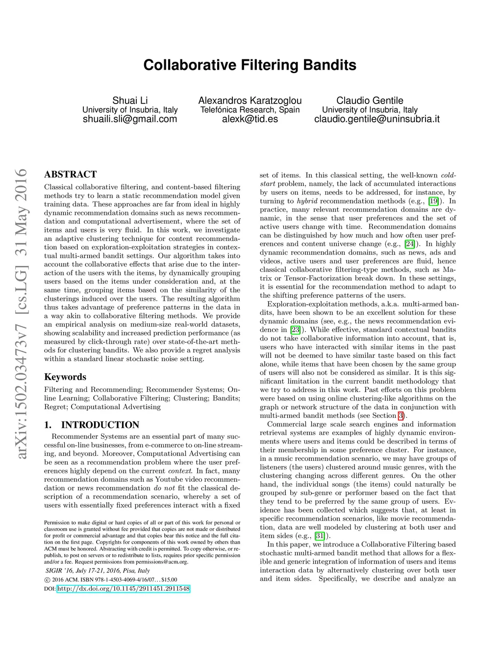 Classical collaborative filtering, and content-based filtering methods try to learn a static recommendation model given training data. These approaches are far from ideal in highly dynamic recommendation domains such as news recommendation and computational advertisement, where the set of items and users is very fluid. In this work, we investigate an adaptive clustering technique for content recommendation based on exploration-exploitation strategies in contextual multi-armed bandit settings. Our algorithm takes into account the collaborative effects that arise due to the interaction of the users with the items, by dynamically grouping users based on the items under consideration and, at the same time, grouping items based on the similarity of the clusterings induced over the users. The resulting algorithm thus takes advantage of preference patterns in the data in a way akin to collaborative filtering methods. We provide an empirical analysis on medium-size real-world datasets, showing scalability and increased prediction performance (as measured by click-through rate) over state-of-the-art methods for clustering bandits. We also provide a regret analysis within a standard linear stochastic noise setting.