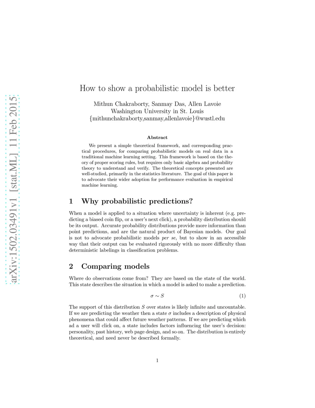 We present a simple theoretical framework, and corresponding practical procedures, for comparing probabilistic models on real data in a traditional machine learning setting. This framework is based on the theory of proper scoring rules, but requires only basic algebra and probability theory to understand and verify. The theoretical concepts presented are well-studied, primarily in the statistics literature. The goal of this paper is to advocate their wider adoption for performance evaluation in empirical machine learning.