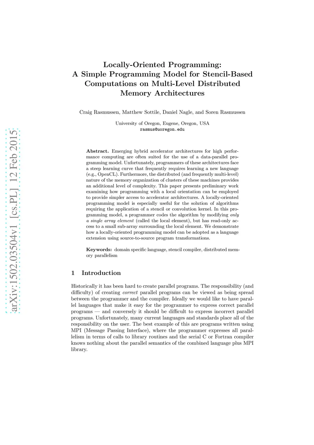 Emerging hybrid accelerator architectures for high performance computing are often suited for the use of a data-parallel programming model. Unfortunately, programmers of these architectures face a steep learning curve that frequently requires learning a new language (e.g., OpenCL). Furthermore, the distributed (and frequently multi-level) nature of the memory organization of clusters of these machines provides an additional level of complexity. This paper presents preliminary work examining how programming with a local orientation can be employed to provide simpler access to accelerator architectures. A locally-oriented programming model is especially useful for the solution of algorithms requiring the application of a stencil or convolution kernel. In this programming model, a programmer codes the algorithm by modifying only a single array element (called the local element), but has read-only access to a small sub-array surrounding the local element. We demonstrate how a locally-oriented programming model can be adopted as a language extension using source-to-source program transformations.