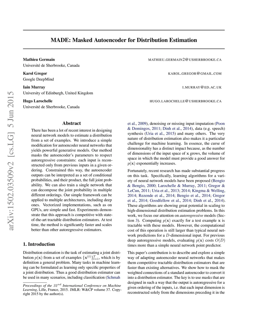MADE: Masked Autoencoder for Distribution Estimation