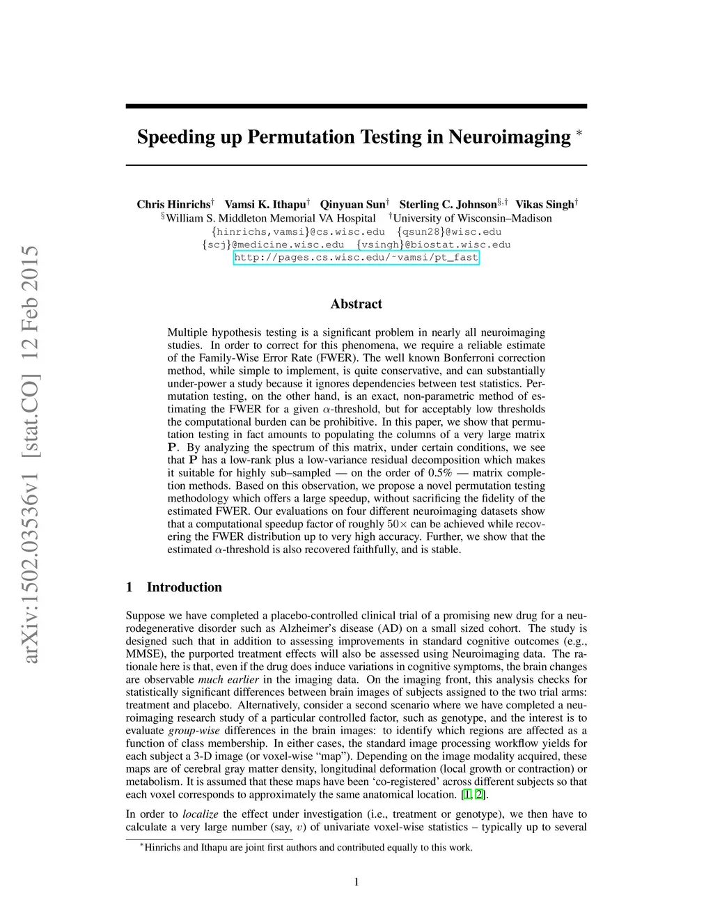 Multiple hypothesis testing is a significant problem in nearly all neuroimaging studies. In order to correct for this phenomena, we require a reliable estimate of the Family-Wise Error Rate (FWER). The well known Bonferroni correction method, while simple to implement, is quite conservative, and can substantially under-power a study because it ignores dependencies between test statistics. Permutation testing, on the other hand, is an exact, non-parametric method of estimating the FWER for a given -threshold, but for acceptably low thresholds the computational burden can be prohibitive. In this paper, we show that permutation testing in fact amounts to populating the columns of a very large matrix . By analyzing the spectrum of this matrix, under certain conditions, we see that has a low-rank plus a low-variance residual decomposition which makes it suitable for highly sub--sampled --- on the order of --- matrix completion methods. Based on this observation, we propose a novel permutation testing methodology which offers a large speedup, without sacrificing the fidelity of the estimated FWER. Our evaluations on four different neuroimaging datasets show that a computational speedup factor of roughly can be achieved while recovering the FWER distribution up to very high accuracy. Further, we show that the estimated -threshold is also recovered faithfully, and is stable.