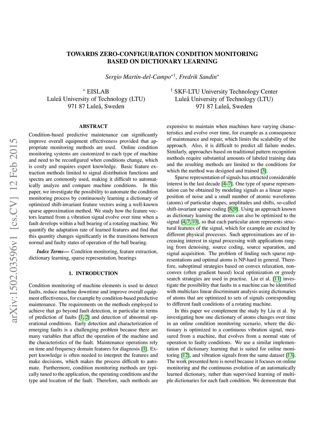 Condition-based predictive maintenance can significantly improve overall equipment effectiveness provided that appropriate monitoring methods are used. Online condition monitoring systems are customized to each type of machine and need to be reconfigured when conditions change, which is costly and requires expert knowledge. Basic feature extraction methods limited to signal distribution functions and spectra are commonly used, making it difficult to automatically analyze and compare machine conditions. In this paper, we investigate the possibility to automate the condition monitoring process by continuously learning a dictionary of optimized shift-invariant feature vectors using a well-known sparse approximation method. We study how the feature vectors learned from a vibration signal evolve over time when a fault develops within a ball bearing of a rotating machine. We quantify the adaptation rate of learned features and find that this quantity changes significantly in the transitions between normal and faulty states of operation of the ball bearing.