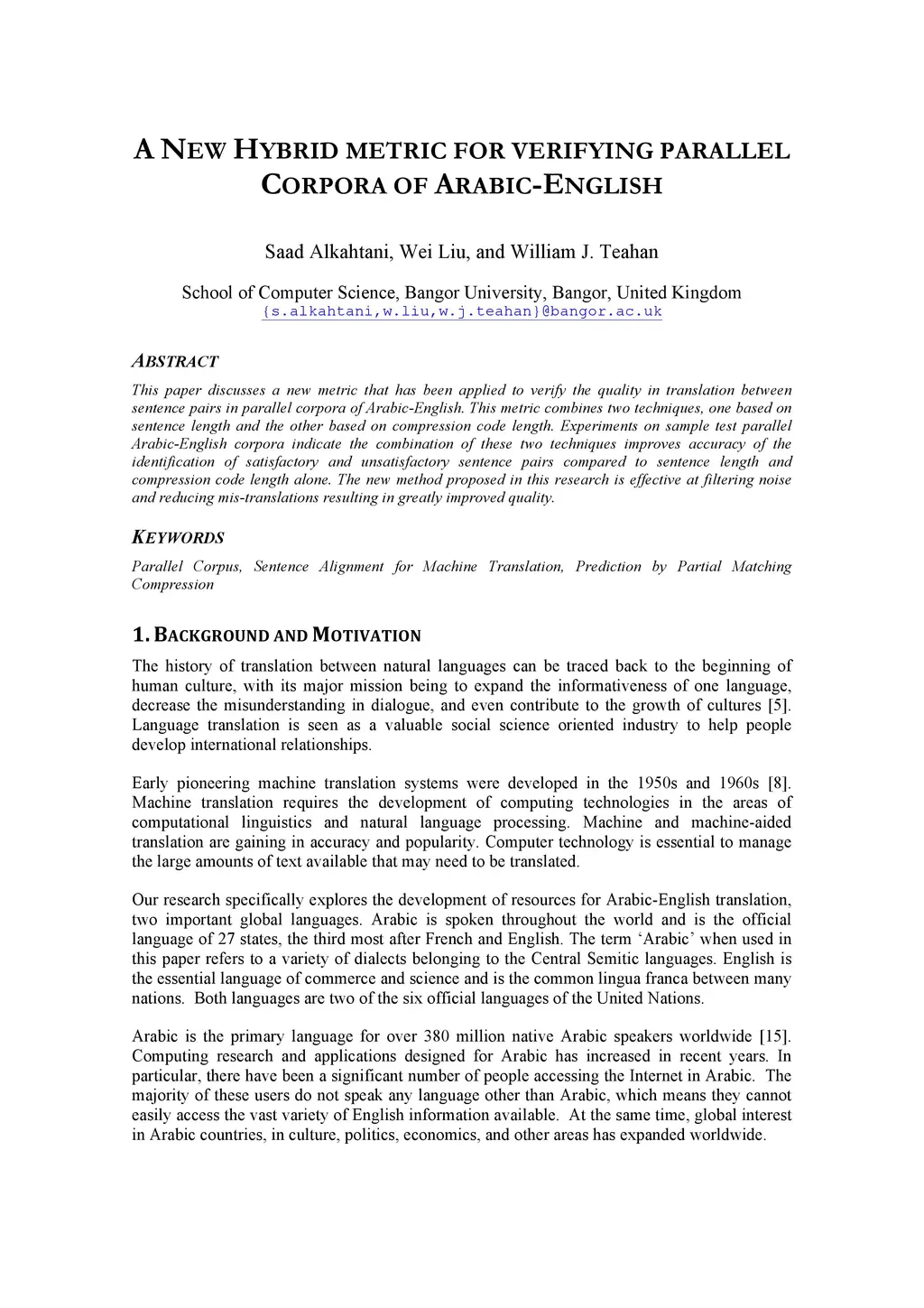 A new hybrid metric for verifying parallel corpora of Arabic-English