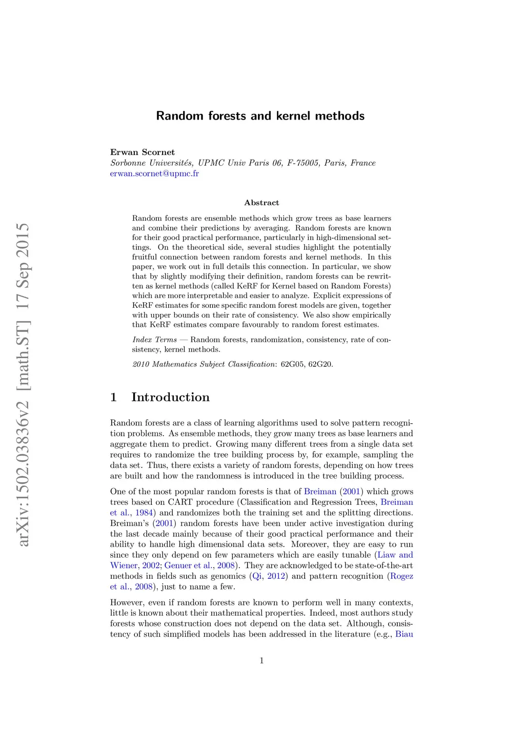 Random forests and kernel methods