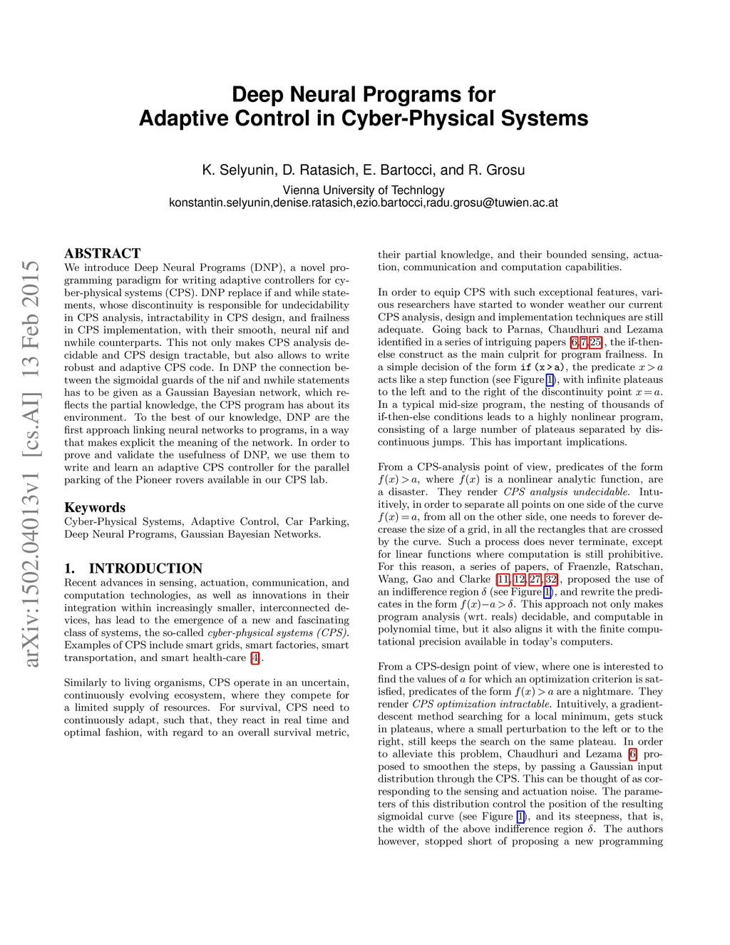 We introduce Deep Neural Programs (DNP), a novel programming paradigm for writing adaptive controllers for cy-ber-physical systems (CPS). DNP replace if and while statements, whose discontinuity is responsible for undecidability in CPS analysis, intractability in CPS design, and frailness in CPS implementation, with their smooth, neural nif and nwhile counterparts. This not only makes CPS analysis decidable and CPS design tractable, but also allows to write robust and adaptive CPS code. In DNP the connection between the sigmoidal guards of the nif and nwhile statements has to be given as a Gaussian Bayesian network, which reflects the partial knowledge, the CPS program has about its environment. To the best of our knowledge, DNP are the first approach linking neural networks to programs, in a way that makes explicit the meaning of the network. In order to prove and validate the usefulness of DNP, we use them to write and learn an adaptive CPS controller for the parallel parking of the Pioneer rovers available in our CPS lab.