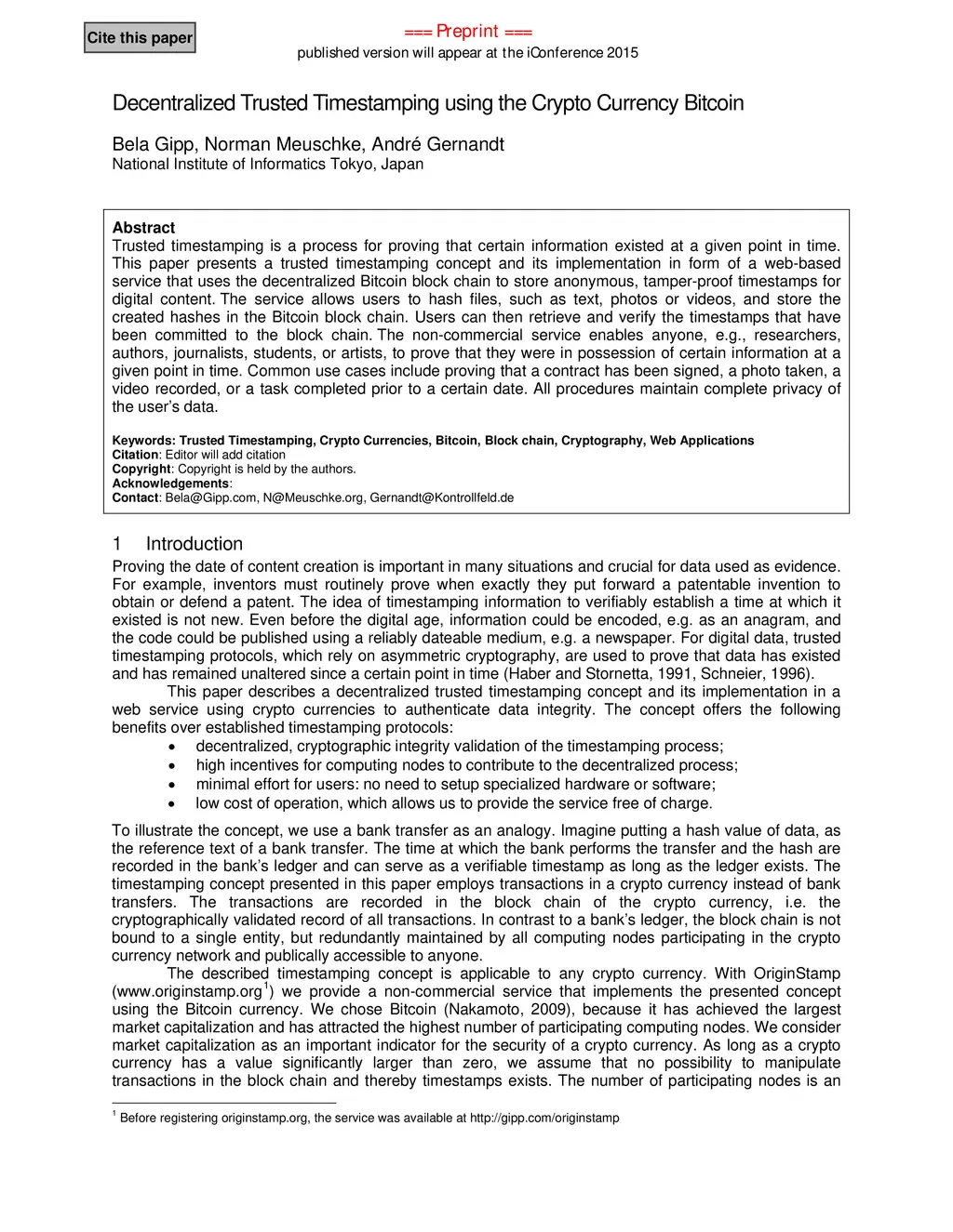 Decentralized Trusted Timestamping using the Crypto Currency Bitcoin