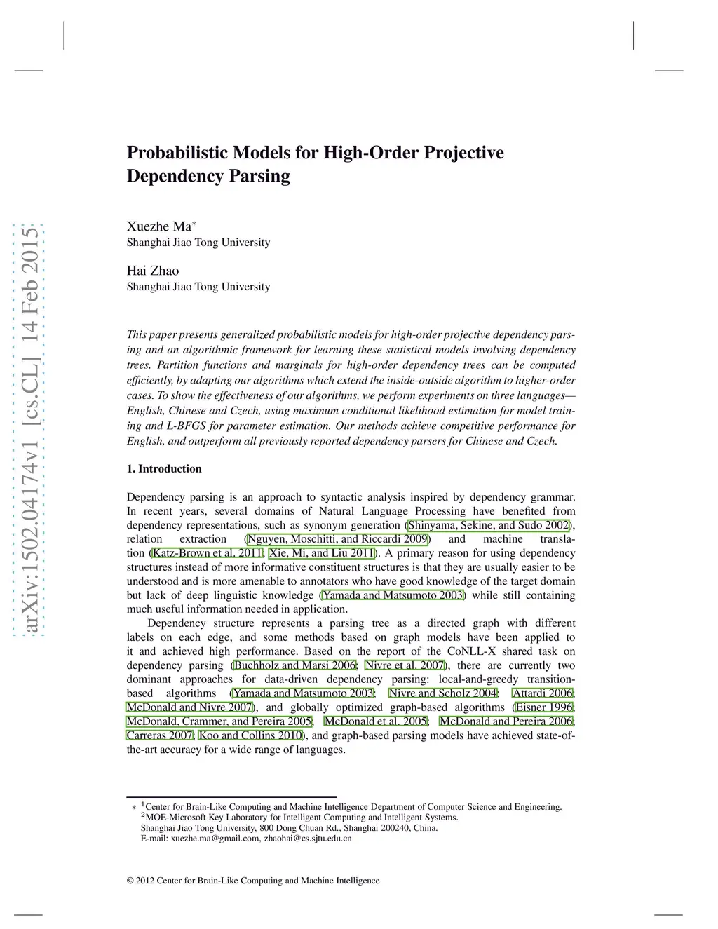 Probabilistic Models for High-Order Projective Dependency Parsing