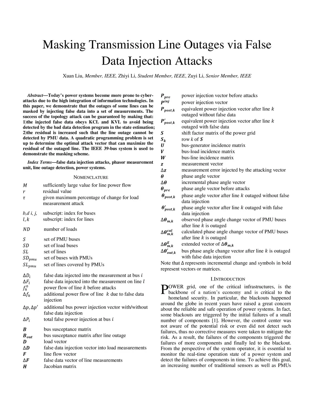 Power systems become more prone to cyber-attacks due to the high integration of information technologies. In this paper, we demonstrate that the outages of some lines can be masked by injecting false data into a set of measurements. The success of the topology attack can be guaranteed by making that: 1)the injected false data obeys KCL and KVL to avoid being detected by the bad data detection program in the state estimation; 2)the residual is increased such that the line outage cannot be detected by PMU data. A quadratic programming problem is set up to determine the optimal attack vector that can maximize the residual of the outaged line. The IEEE 39-bus system is used to demonstrate the masking scheme.