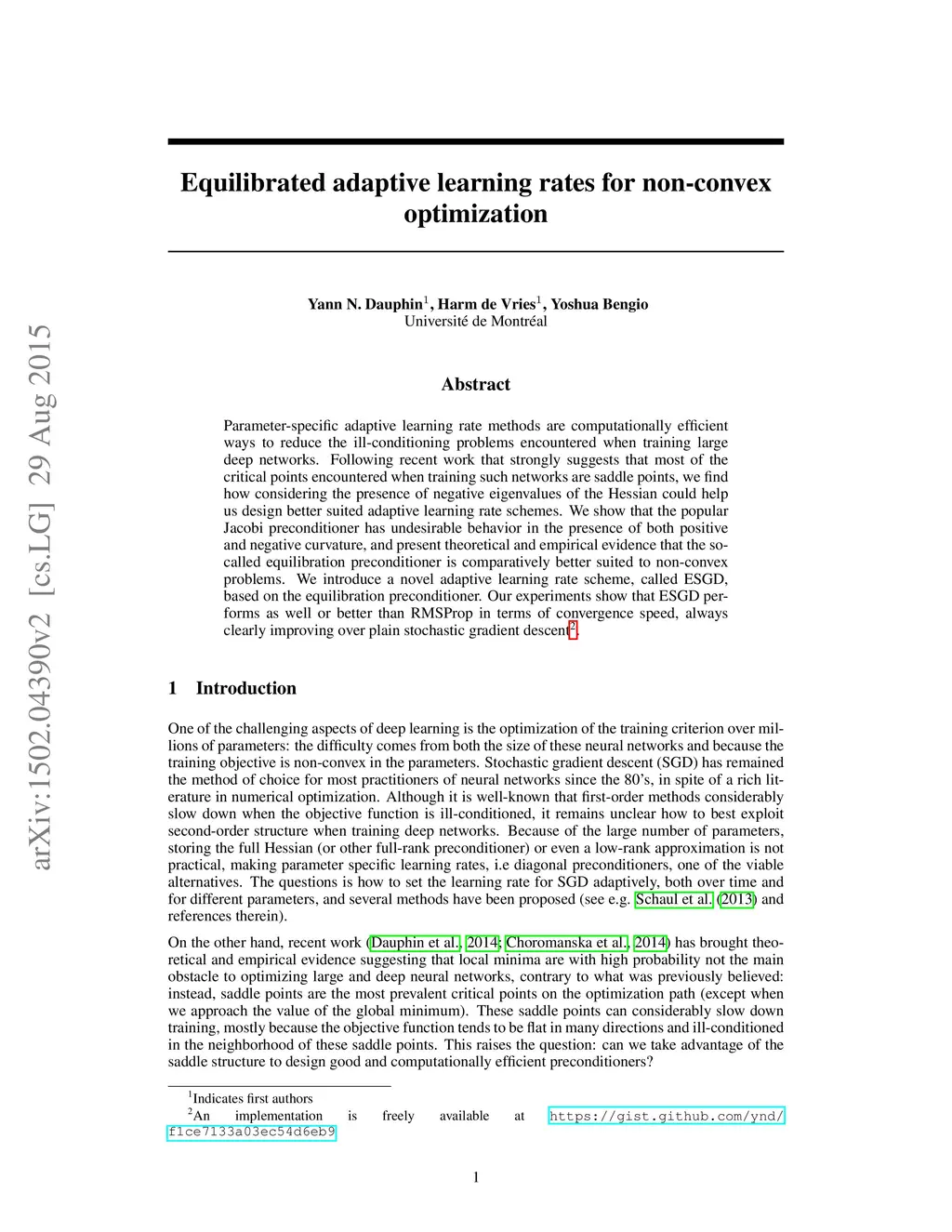 Parameter-specific adaptive learning rate methods are computationally efficient ways to reduce the ill-conditioning problems encountered when training large deep networks. Following recent work that strongly suggests that most of the critical points encountered when training such networks are saddle points, we find how considering the presence of negative eigenvalues of the Hessian could help us design better suited adaptive learning rate schemes. We show that the popular Jacobi preconditioner has undesirable behavior in the presence of both positive and negative curvature, and present theoretical and empirical evidence that the so-called equilibration preconditioner is comparatively better suited to non-convex problems. We introduce a novel adaptive learning rate scheme, called ESGD, based on the equilibration preconditioner. Our experiments show that ESGD performs as well or better than RMSProp in terms of convergence speed, always clearly improving over plain stochastic gradient descent.