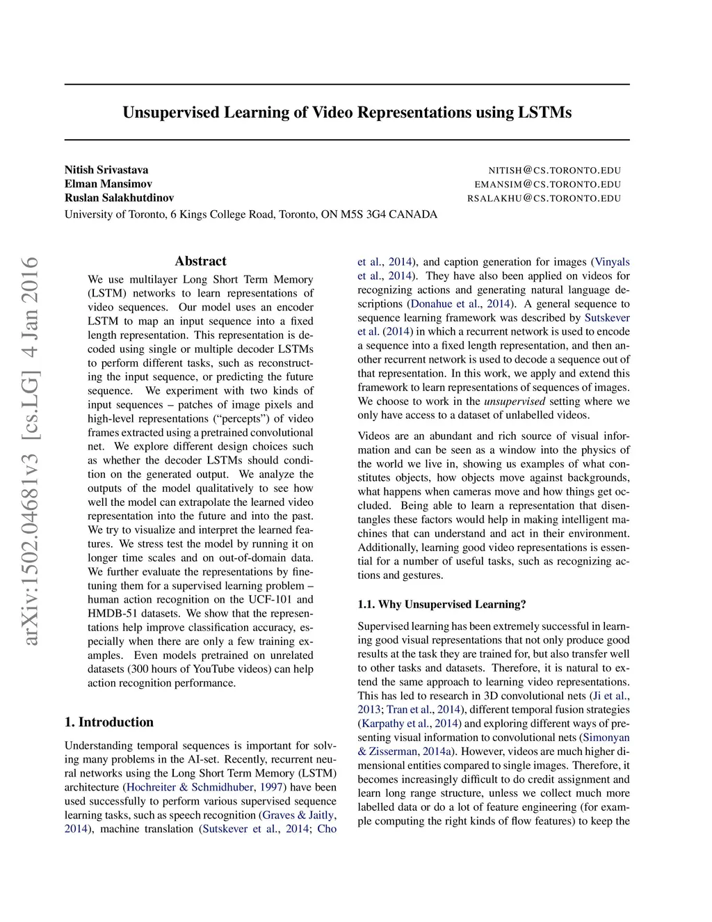 Unsupervised Learning of Video Representations using LSTMs
