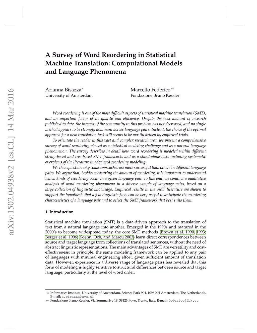 Word reordering is one of the most difficult aspects of statistical machine translation (SMT), and an important factor of its quality and efficiency. Despite the vast amount of research published to date, the interest of the community in this problem has not decreased, and no single method appears to be strongly dominant across language pairs. Instead, the choice of the optimal approach for a new translation task still seems to be mostly driven by empirical trials. To orientate the reader in this vast and complex research area, we present a comprehensive survey of word reordering viewed as a statistical modeling challenge and as a natural language phenomenon. The survey describes in detail how word reordering is modeled within different string-based and tree-based SMT frameworks and as a stand-alone task, including systematic overviews of the literature in advanced reordering modeling. We then question why some approaches are more successful than others in different language pairs. We argue that, besides measuring the amount of reordering, it is important to understand which kinds of reordering occur in a given language pair. To this end, we conduct a qualitative analysis of word reordering phenomena in a diverse sample of language pairs, based on a large collection of linguistic knowledge. Empirical results in the SMT literature are shown to support the hypothesis that a few linguistic facts can be very useful to anticipate the reordering characteristics of a language pair and to select the SMT framework that best suits them.