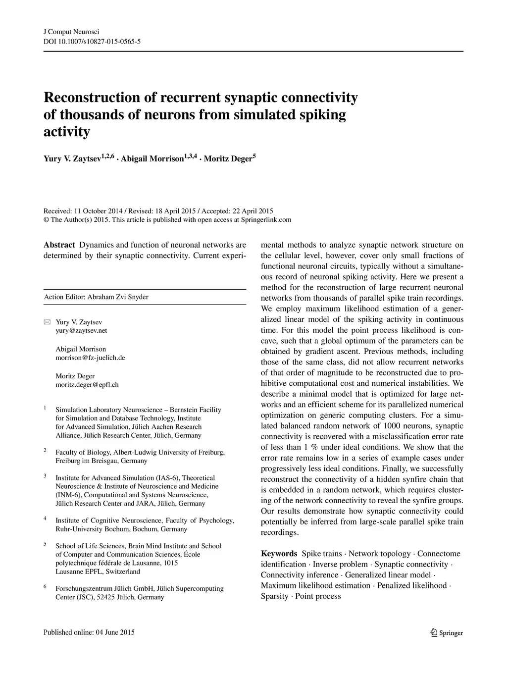 Dynamics and function of neuronal networks are determined by their synaptic connectivity. Current experimental methods to analyze synaptic network structure on the cellular level, however, cover only small fractions of functional neuronal circuits, typically without a simultaneous record of neuronal spiking activity. Here we present a method for the reconstruction of large recurrent neuronal networks from thousands of parallel spike train recordings. We employ maximum likelihood estimation of a generalized linear model of the spiking activity in continuous time. For this model the point process likelihood is concave, such that a global optimum of the parameters can be obtained by gradient ascent. Previous methods, including those of the same class, did not allow recurrent networks of that order of magnitude to be reconstructed due to prohibitive computational cost and numerical instabilities. We describe a minimal model that is optimized for large networks and an efficient scheme for its parallelized numerical optimization on generic computing clusters. For a simulated balanced random network of 1000 neurons, synaptic connectivity is recovered with a misclassification error rate of less than 1% under ideal conditions. We show that the error rate remains low in a series of example cases under progressively less ideal conditions. Finally, we successfully reconstruct the connectivity of a hidden synfire chain that is embedded in a random network, which requires clustering of the network connectivity to reveal the synfire groups. Our results demonstrate how synaptic connectivity could potentially be inferred from large-scale parallel spike train recordings.
