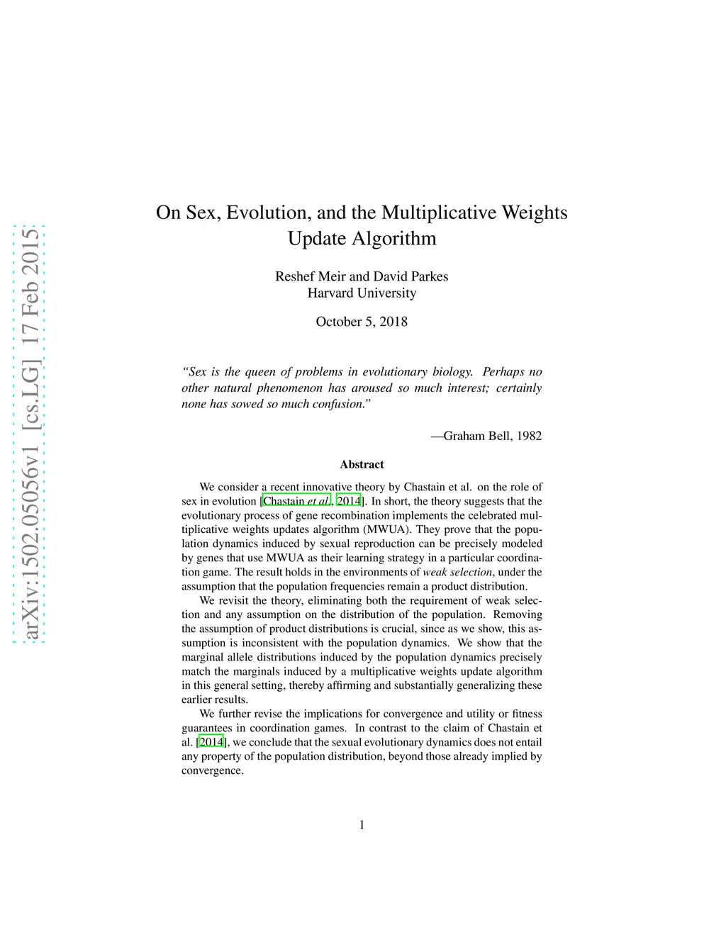 We consider a recent innovative theory by Chastain et al. on the role of sex in evolution [PNAS'14]. In short, the theory suggests that the evolutionary process of gene recombination implements the celebrated multiplicative weights updates algorithm (MWUA). They prove that the population dynamics induced by sexual reproduction can be precisely modeled by genes that use MWUA as their learning strategy in a particular coordination game. The result holds in the environments of \emph{weak selection}, under the assumption that the population frequencies remain a product distribution. We revisit the theory, eliminating both the requirement of weak selection and any assumption on the distribution of the population. Removing the assumption of product distributions is crucial, since as we show, this assumption is inconsistent with the population dynamics. We show that the marginal allele distributions induced by the population dynamics precisely match the marginals induced by a multiplicative weights update algorithm in this general setting, thereby affirming and substantially generalizing these earlier results. We further revise the implications for convergence and utility or fitness guarantees in coordination games. In contrast to the claim of Chastain et al.[PNAS'14], we conclude that the sexual evolutionary dynamics does not entail any property of the population distribution, beyond those already implied by convergence.