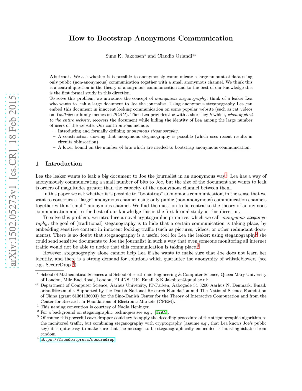 We ask whether it is possible to anonymously communicate a large amount of data using only public (non-anonymous) communication together with a small anonymous channel. We think this is a central question in the theory of anonymous communication and to the best of our knowledge this is the first formal study in this direction. To solve this problem, we introduce the concept of anonymous steganography: think of a leaker Lea who wants to leak a large document to Joe the journalist. Using anonymous steganography Lea can embed this document in innocent looking communication on some popular website (such as cat videos on YouTube or funny memes on 9GAG). Then Lea provides Joe with a short key which, when applied to the entire website, recovers the document while hiding the identity of Lea among the large number of users of the website. Our contributions include: - Introducing and formally defining anonymous steganography, - A construction showing that anonymous steganography is possible (which uses recent results in circuits obfuscation), - A lower bound on the number of bits which are needed to bootstrap anonymous communication.