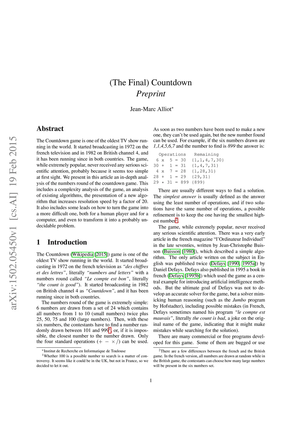 The Countdown game is one of the oldest TV show running in the world. It started broadcasting in 1972 on the french television and in 1982 on British channel 4, and it has been running since in both countries. The game, while extremely popular, never received any serious scientific attention, probably because it seems too simple at first sight. We present in this article an in-depth analysis of the numbers round of the countdown game. This includes a complexity analysis of the game, an analysis of existing algorithms, the presentation of a new algorithm that increases resolution speed by a factor of 20. It also includes some leads on how to turn the game into a more difficult one, both for a human player and for a computer, and even to transform it into a probably undecidable problem.