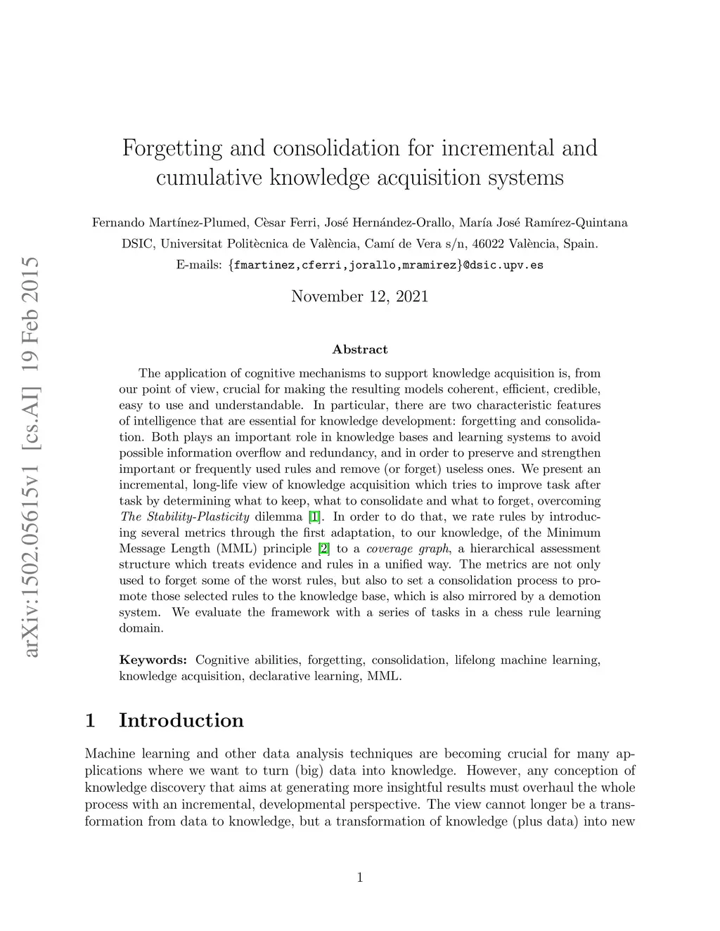 The application of cognitive mechanisms to support knowledge acquisition is, from our point of view, crucial for making the resulting models coherent, efficient, credible, easy to use and understandable. In particular, there are two characteristic features of intelligence that are essential for knowledge development: forgetting and consolidation. Both plays an important role in knowledge bases and learning systems to avoid possible information overflow and redundancy, and in order to preserve and strengthen important or frequently used rules and remove (or forget) useless ones. We present an incremental, long-life view of knowledge acquisition which tries to improve task after task by determining what to keep, what to consolidate and what to forget, overcoming The Stability-Plasticity dilemma. In order to do that, we rate rules by introducing several metrics through the first adaptation, to our knowledge, of the Minimum Message Length (MML) principle to a coverage graph, a hierarchical assessment structure which treats evidence and rules in a unified way. The metrics are not only used to forget some of the worst rules, but also to set a consolidation process to promote those selected rules to the knowledge base, which is also mirrored by a demotion system. We evaluate the framework with a series of tasks in a chess rule learning domain.