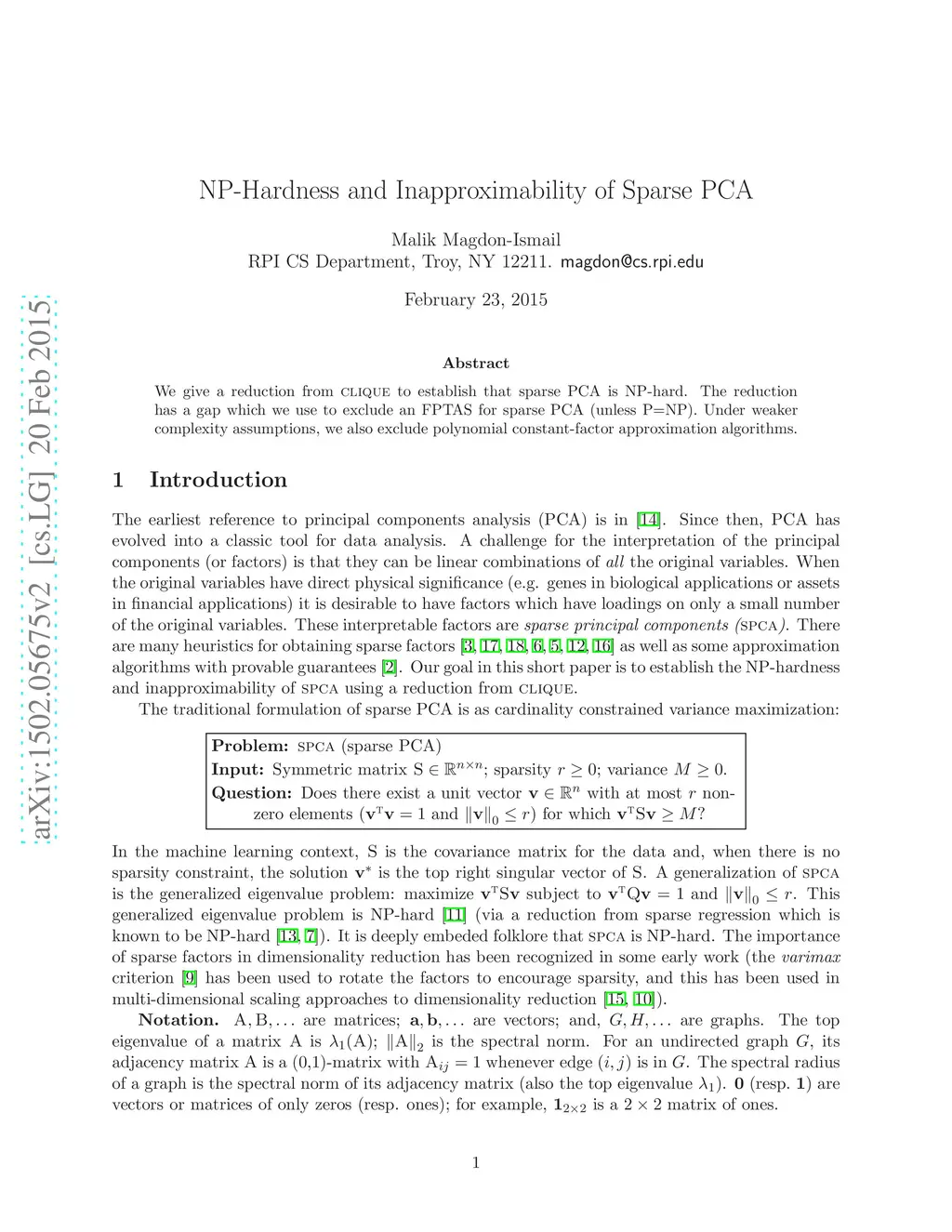 We give a reduction from {\sc clique} to establish that sparse PCA is NP-hard. The reduction has a gap which we use to exclude an FPTAS for sparse PCA (unless P=NP). Under weaker complexity assumptions, we also exclude polynomial constant-factor approximation algorithms.