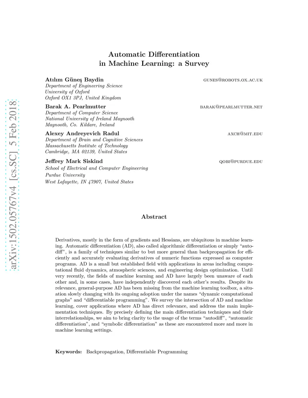 Derivatives, mostly in the form of gradients and Hessians, are ubiquitous in machine learning. Automatic differentiation (AD), also called algorithmic differentiation or simply "autodiff", is a family of techniques similar to but more general than backpropagation for efficiently and accurately evaluating derivatives of numeric functions expressed as computer programs. AD is a small but established field with applications in areas including computational fluid dynamics, atmospheric sciences, and engineering design optimization. Until very recently, the fields of machine learning and AD have largely been unaware of each other and, in some cases, have independently discovered each other's results. Despite its relevance, general-purpose AD has been missing from the machine learning toolbox, a situation slowly changing with its ongoing adoption under the names "dynamic computational graphs" and "differentiable programming". We survey the intersection of AD and machine learning, cover applications where AD has direct relevance, and address the main implementation techniques. By precisely defining the main differentiation techniques and their interrelationships, we aim to bring clarity to the usage of the terms "autodiff", "automatic differentiation", and "symbolic differentiation" as these are encountered more and more in machine learning settings.