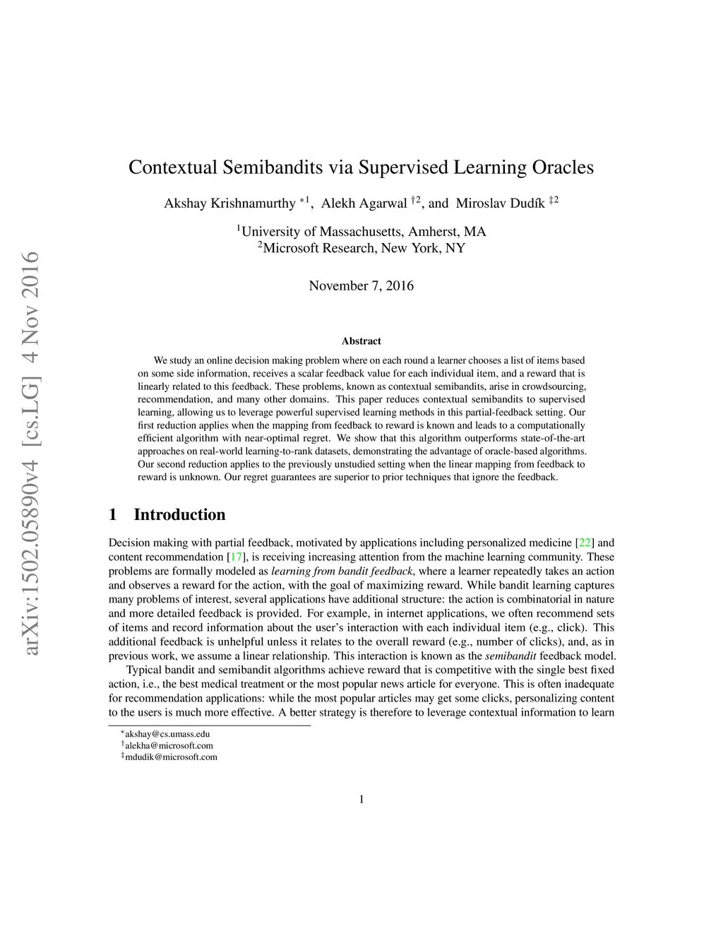 Contextual Semibandits via Supervised Learning Oracles