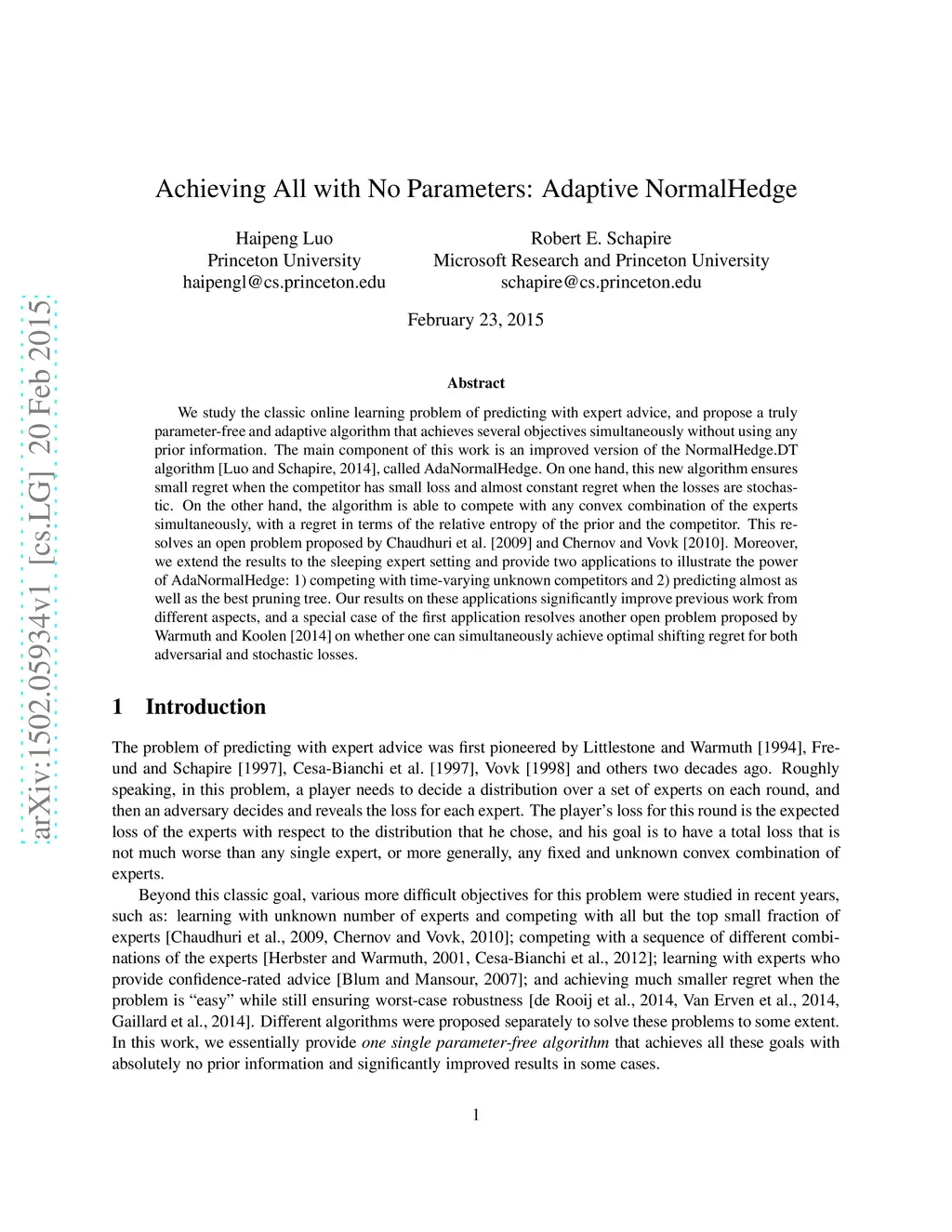 We study the classic online learning problem of predicting with expert advice, and propose a truly parameter-free and adaptive algorithm that achieves several objectives simultaneously without using any prior information. The main component of this work is an improved version of the NormalHedge.DT algorithm (Luo and Schapire, 2014), called AdaNormalHedge. On one hand, this new algorithm ensures small regret when the competitor has small loss and almost constant regret when the losses are stochastic. On the other hand, the algorithm is able to compete with any convex combination of the experts simultaneously, with a regret in terms of the relative entropy of the prior and the competitor. This resolves an open problem proposed by Chaudhuri et al. (2009) and Chernov and Vovk (2010). Moreover, we extend the results to the sleeping expert setting and provide two applications to illustrate the power of AdaNormalHedge: 1) competing with time-varying unknown competitors and 2) predicting almost as well as the best pruning tree. Our results on these applications significantly improve previous work from different aspects, and a special case of the first application resolves another open problem proposed by Warmuth and Koolen (2014) on whether one can simultaneously achieve optimal shifting regret for both adversarial and stochastic losses.