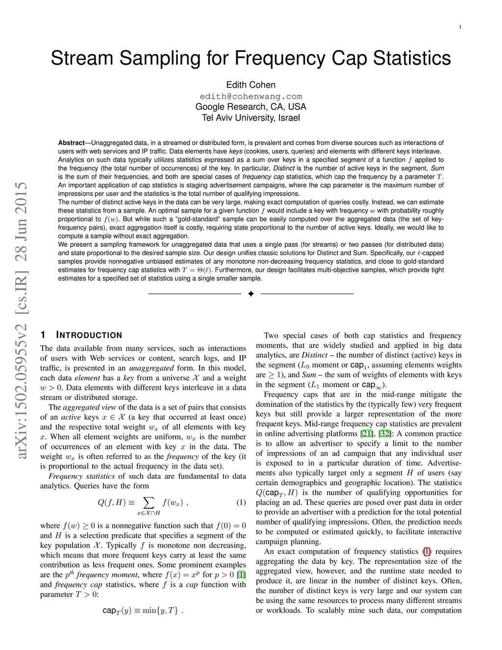 Unaggregated data, in streamed or distributed form, is prevalent and come from diverse application domains which include interactions of users with web services and IP traffic. Data elements have {\em keys} (cookies, users, queries) and elements with different keys interleave. Analytics on such data typically utilizes statistics stated in terms of the frequencies of keys. The two most common statistics are {\em distinct}, which is the number of active keys in a specified segment, and {\em sum}, which is the sum of the frequencies of keys in the segment. Both are special cases of {\em cap} statistics, defined as the sum of frequencies {\em capped} by a parameter , which are popular in online advertising platforms. Aggregation by key, however, is costly, requiring state proportional to the number of distinct keys, and therefore we are interested in estimating these statistics or more generally, sampling the data, without aggregation. We present a sampling framework for unaggregated data that uses a single pass (for streams) or two passes (for distributed data) and state proportional to the desired sample size. Our design provides the first effective solution for general frequency cap statistics. Our -capped samples provide estimates with tight statistical guarantees for cap statistics with and nonnegative unbiased estimates of {\em any} monotone non-decreasing frequency statistics. An added benefit of our unified design is facilitating {\em multi-objective samples}, which provide estimates with statistical guarantees for a specified set of different statistics, using a single, smaller sample.