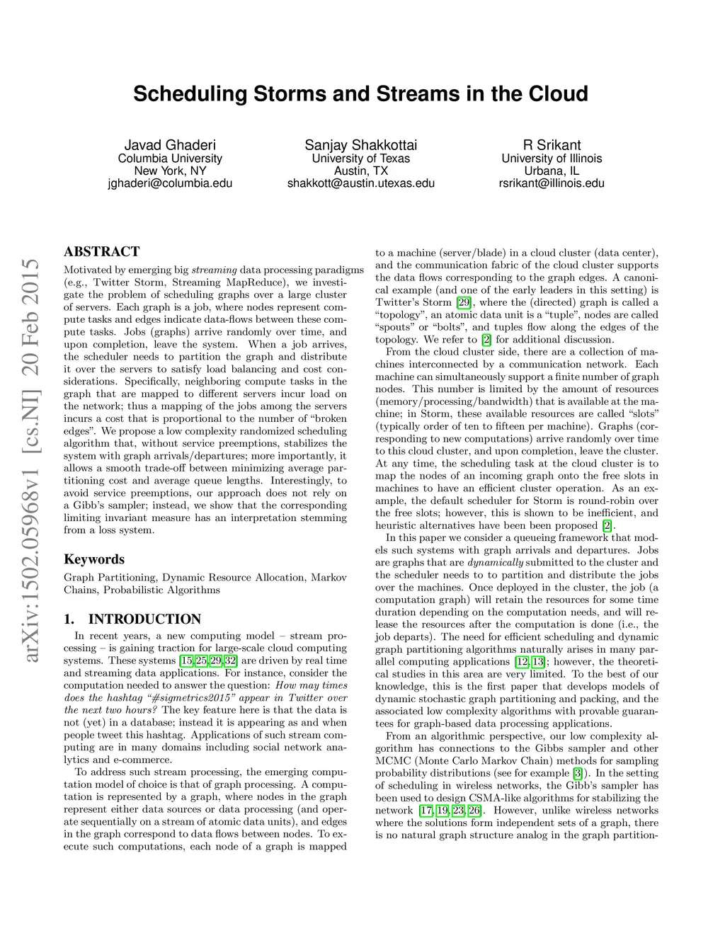 Motivated by emerging big streaming data processing paradigms (e.g., Twitter Storm, Streaming MapReduce), we investigate the problem of scheduling graphs over a large cluster of servers. Each graph is a job, where nodes represent compute tasks and edges indicate data-flows between these compute tasks. Jobs (graphs) arrive randomly over time, and upon completion, leave the system. When a job arrives, the scheduler needs to partition the graph and distribute it over the servers to satisfy load balancing and cost considerations. Specifically, neighboring compute tasks in the graph that are mapped to different servers incur load on the network; thus a mapping of the jobs among the servers incurs a cost that is proportional to the number of "broken edges". We propose a low complexity randomized scheduling algorithm that, without service preemptions, stabilizes the system with graph arrivals/departures; more importantly, it allows a smooth trade-off between minimizing average partitioning cost and average queue lengths. Interestingly, to avoid service preemptions, our approach does not rely on a Gibbs sampler; instead, we show that the corresponding limiting invariant measure has an interpretation stemming from a loss system.