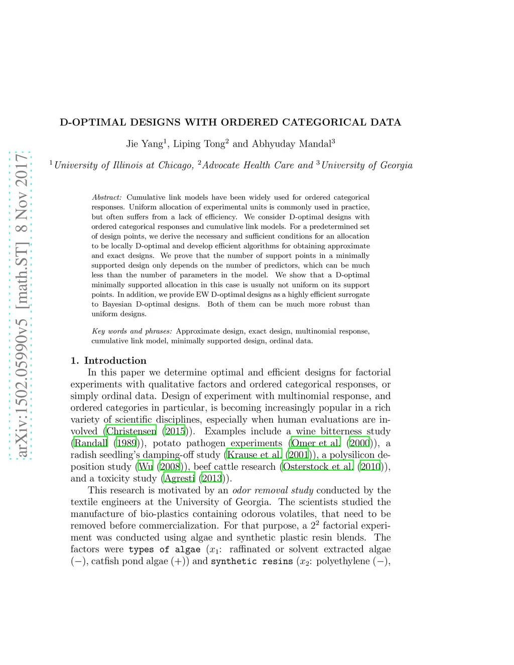 Cumulative link models have been widely used for ordered categorical responses. Uniform allocation of experimental units is commonly used in practice, but often suffers from a lack of efficiency. We consider D-optimal designs with ordered categorical responses and cumulative link models. For a predetermined set of design points, we derive the necessary and sufficient conditions for an allocation to be locally D-optimal and develop efficient algorithms for obtaining approximate and exact designs. We prove that the number of support points in a minimally supported design only depends on the number of predictors, which can be much less than the number of parameters in the model. We show that a D-optimal minimally supported allocation in this case is usually not uniform on its support points. In addition, we provide EW D-optimal designs as a highly efficient surrogate to Bayesian D-optimal designs. Both of them can be much more robust than uniform designs.