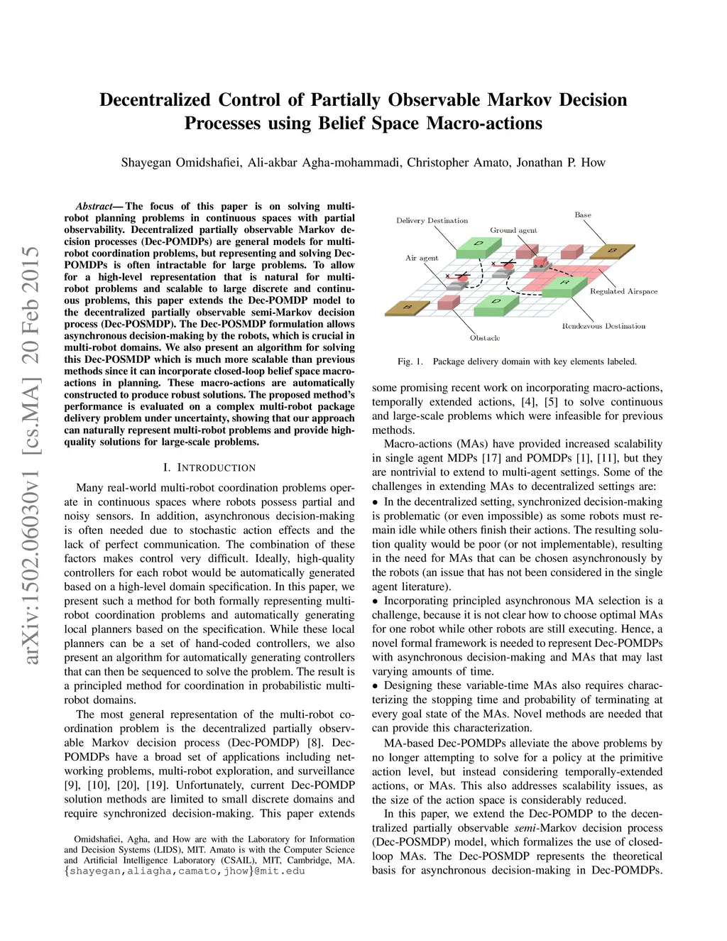 The focus of this paper is on solving multi-robot planning problems in continuous spaces with partial observability. Decentralized partially observable Markov decision processes (Dec-POMDPs) are general models for multi-robot coordination problems, but representing and solving Dec-POMDPs is often intractable for large problems. To allow for a high-level representation that is natural for multi-robot problems and scalable to large discrete and continuous problems, this paper extends the Dec-POMDP model to the decentralized partially observable semi-Markov decision process (Dec-POSMDP). The Dec-POSMDP formulation allows asynchronous decision-making by the robots, which is crucial in multi-robot domains. We also present an algorithm for solving this Dec-POSMDP which is much more scalable than previous methods since it can incorporate closed-loop belief space macro-actions in planning. These macro-actions are automatically constructed to produce robust solutions. The proposed method's performance is evaluated on a complex multi-robot package delivery problem under uncertainty, showing that our approach can naturally represent multi-robot problems and provide high-quality solutions for large-scale problems.