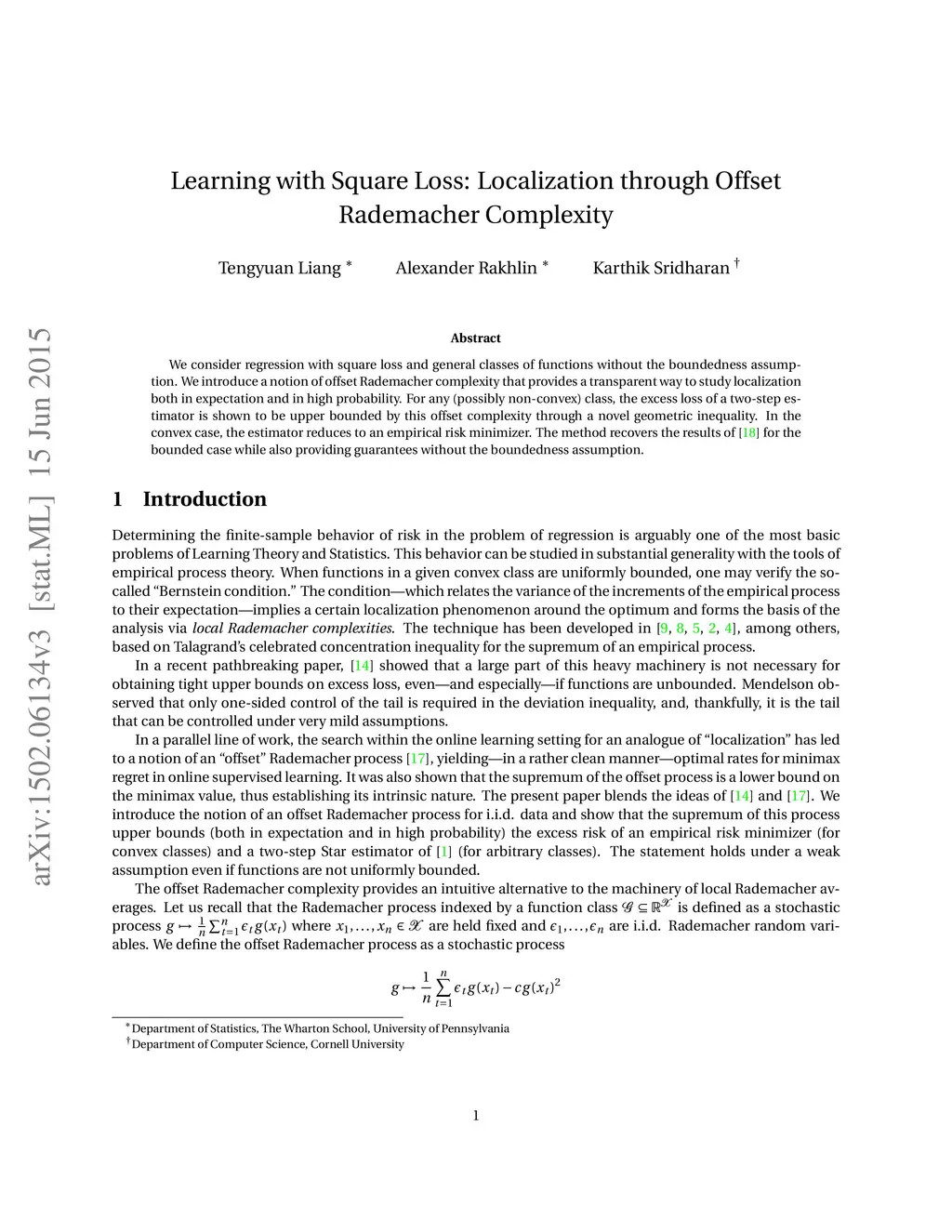 We consider regression with square loss and general classes of functions without the boundedness assumption. We introduce a notion of offset Rademacher complexity that provides a transparent way to study localization both in expectation and in high probability. For any (possibly non-convex) class, the excess loss of a two-step estimator is shown to be upper bounded by this offset complexity through a novel geometric inequality. In the convex case, the estimator reduces to an empirical risk minimizer. The method recovers the results of \citep{RakSriTsy15} for the bounded case while also providing guarantees without the boundedness assumption.