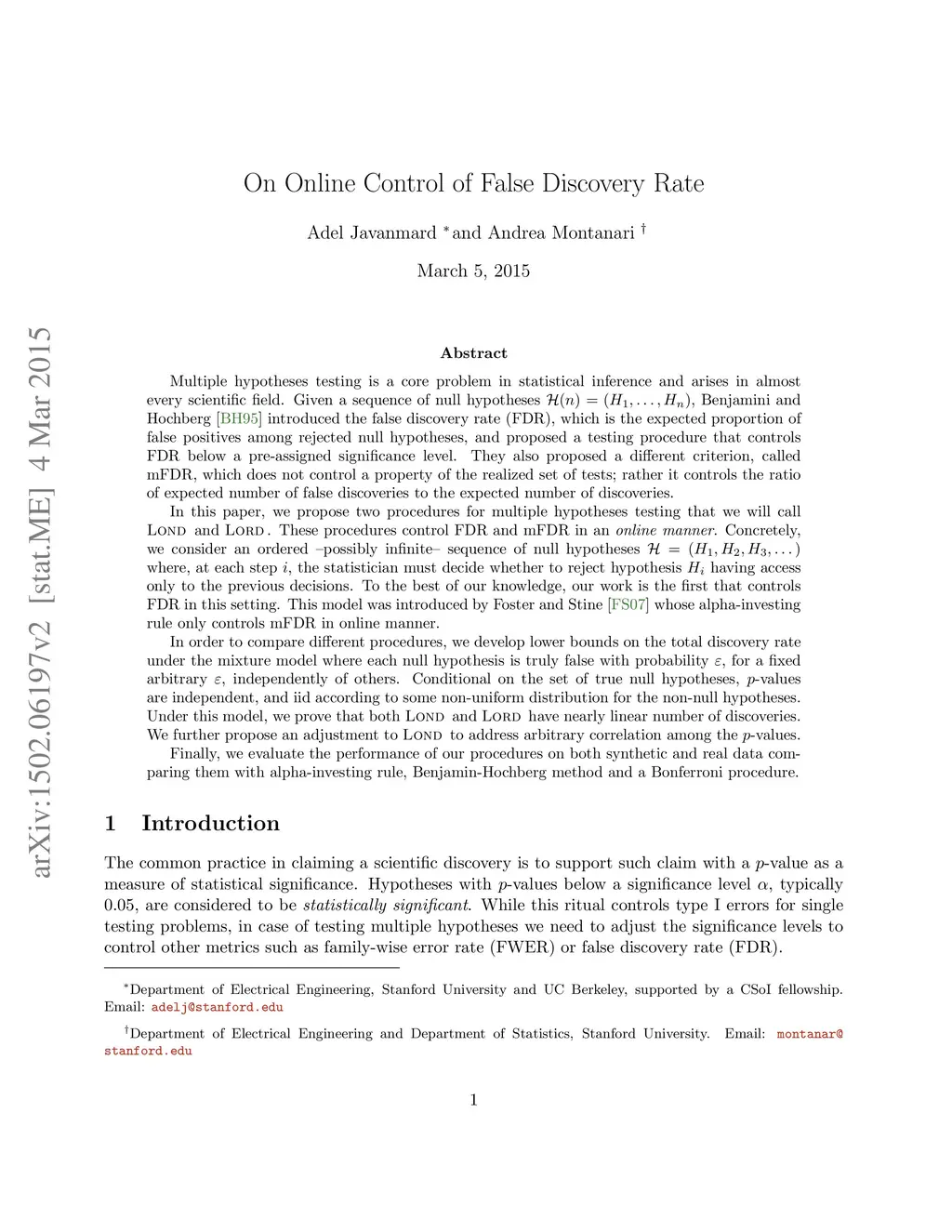 On Online Control of False Discovery Rate
