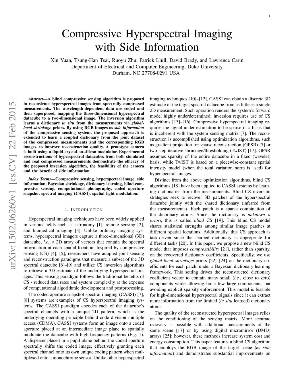 A blind compressive sensing algorithm is proposed to reconstruct hyperspectral images from spectrally-compressed measurements.The wavelength-dependent data are coded and then superposed, mapping the three-dimensional hyperspectral datacube to a two-dimensional image. The inversion algorithm learns a dictionary {\em in situ} from the measurements via global-local shrinkage priors. By using RGB images as side information of the compressive sensing system, the proposed approach is extended to learn a coupled dictionary from the joint dataset of the compressed measurements and the corresponding RGB images, to improve reconstruction quality. A prototype camera is built using a liquid-crystal-on-silicon modulator. Experimental reconstructions of hyperspectral datacubes from both simulated and real compressed measurements demonstrate the efficacy of the proposed inversion algorithm, the feasibility of the camera and the benefit of side information.