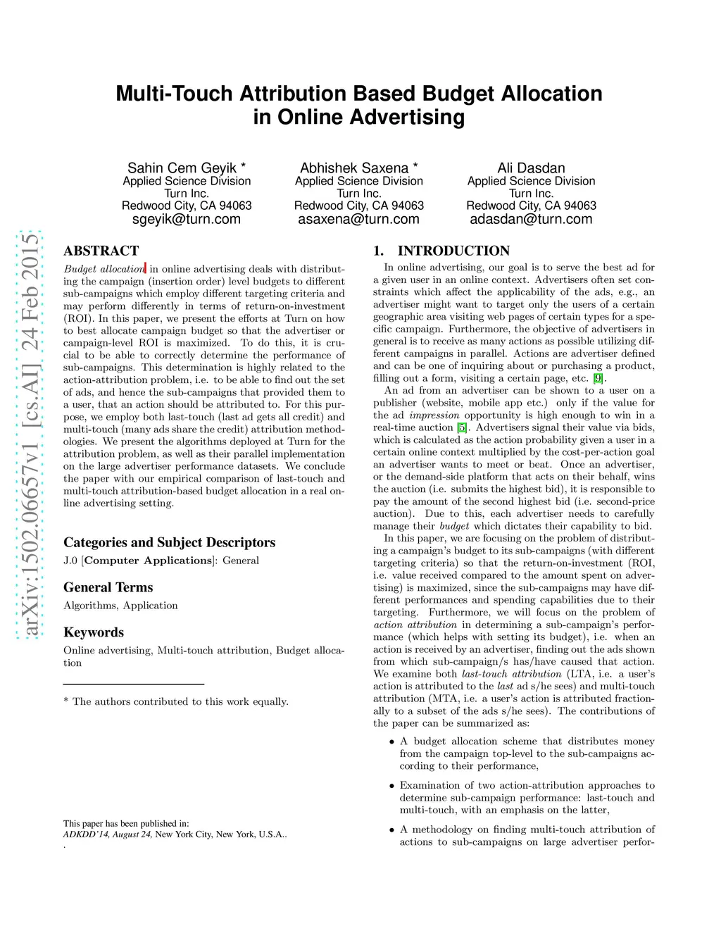 Budget allocation in online advertising deals with distributing the campaign (insertion order) level budgets to different sub-campaigns which employ different targeting criteria and may perform differently in terms of return-on-investment (ROI). In this paper, we present the efforts at Turn on how to best allocate campaign budget so that the advertiser or campaign-level ROI is maximized. To do this, it is crucial to be able to correctly determine the performance of sub-campaigns. This determination is highly related to the action-attribution problem, i.e. to be able to find out the set of ads, and hence the sub-campaigns that provided them to a user, that an action should be attributed to. For this purpose, we employ both last-touch (last ad gets all credit) and multi-touch (many ads share the credit) attribution methodologies. We present the algorithms deployed at Turn for the attribution problem, as well as their parallel implementation on the large advertiser performance datasets. We conclude the paper with our empirical comparison of last-touch and multi-touch attribution-based budget allocation in a real online advertising setting.