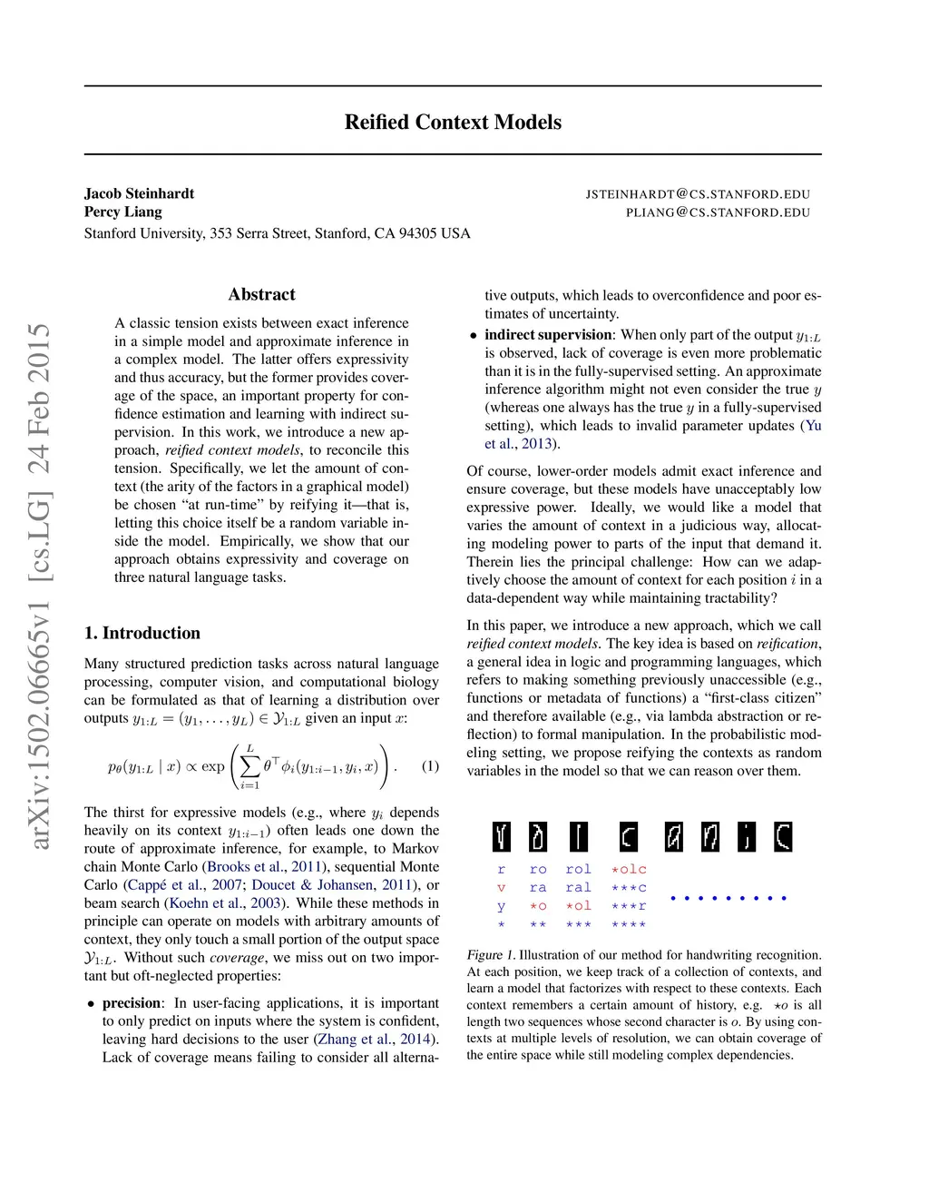 A classic tension exists between exact inference in a simple model and approximate inference in a complex model. The latter offers expressivity and thus accuracy, but the former provides coverage of the space, an important property for confidence estimation and learning with indirect supervision. In this work, we introduce a new approach, reified context models, to reconcile this tension. Specifically, we let the amount of context (the arity of the factors in a graphical model) be chosen "at run-time" by reifying it---that is, letting this choice itself be a random variable inside the model. Empirically, we show that our approach obtains expressivity and coverage on three natural language tasks.
