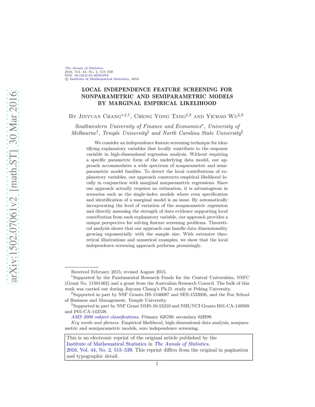 We consider an independence feature screening technique for identifying explanatory variables that locally contribute to the response variable in high-dimensional regression analysis. Without requiring a specific parametric form of the underlying data model, our approach accommodates a wide spectrum of nonparametric and semiparametric model families. To detect the local contributions of explanatory variables, our approach constructs empirical likelihood locally in conjunction with marginal nonparametric regressions. Since our approach actually requires no estimation, it is advantageous in scenarios such as the single-index models where even specification and identification of a marginal model is an issue. By automatically incorporating the level of variation of the nonparametric regression and directly assessing the strength of data evidence supporting local contribution from each explanatory variable, our approach provides a unique perspective for solving feature screening problems. Theoretical analysis shows that our approach can handle data dimensionality growing exponentially with the sample size. With extensive theoretical illustrations and numerical examples, we show that the local independence screening approach performs promisingly.
