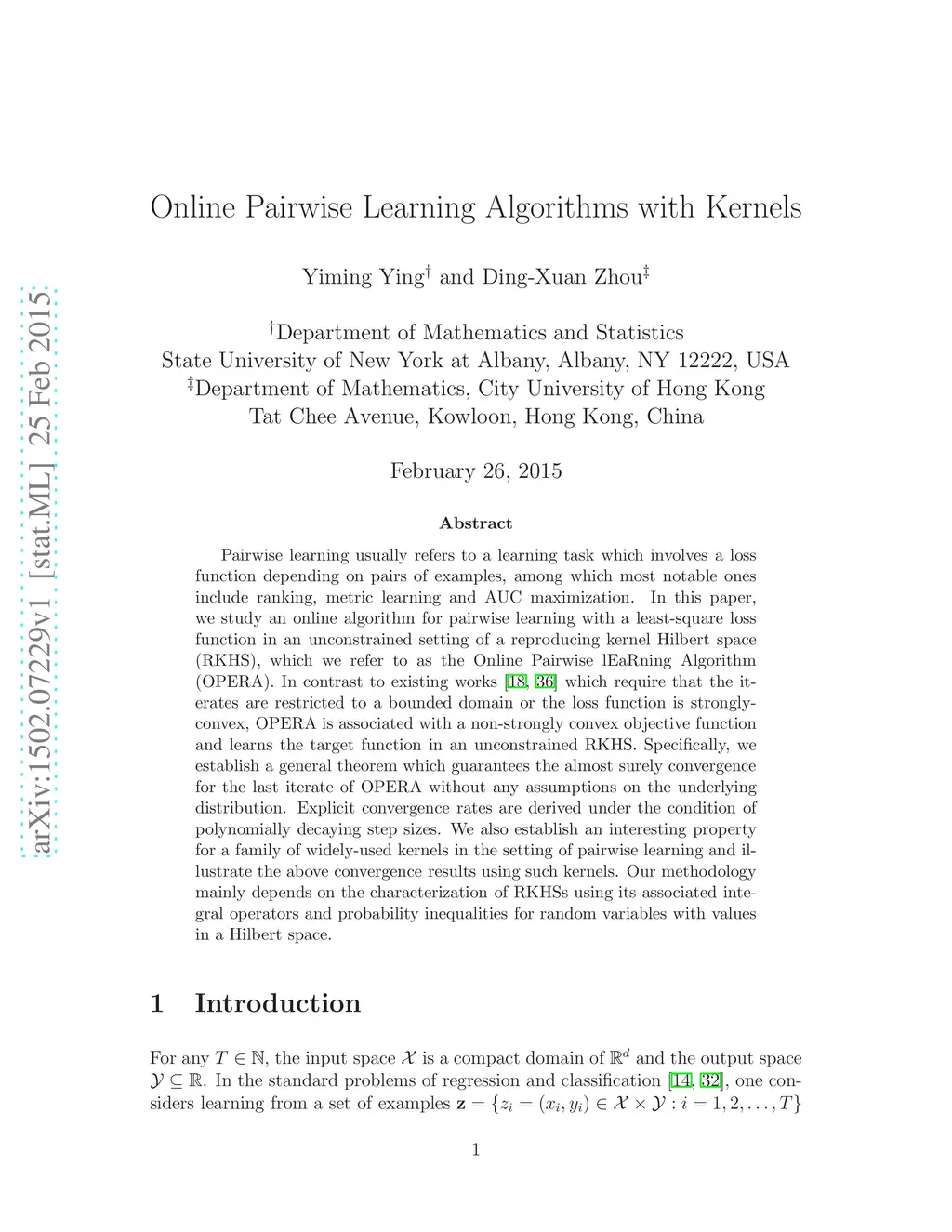 Pairwise learning usually refers to a learning task which involves a loss function depending on pairs of examples, among which most notable ones include ranking, metric learning and AUC maximization. In this paper, we study an online algorithm for pairwise learning with a least-square loss function in an unconstrained setting of a reproducing kernel Hilbert space (RKHS), which we refer to as the Online Pairwise lEaRning Algorithm (OPERA). In contrast to existing works \cite{Kar,Wang} which require that the iterates are restricted to a bounded domain or the loss function is strongly-convex, OPERA is associated with a non-strongly convex objective function and learns the target function in an unconstrained RKHS. Specifically, we establish a general theorem which guarantees the almost surely convergence for the last iterate of OPERA without any assumptions on the underlying distribution. Explicit convergence rates are derived under the condition of polynomially decaying step sizes. We also establish an interesting property for a family of widely-used kernels in the setting of pairwise learning and illustrate the above convergence results using such kernels. Our methodology mainly depends on the characterization of RKHSs using its associated integral operators and probability inequalities for random variables with values in a Hilbert space.
