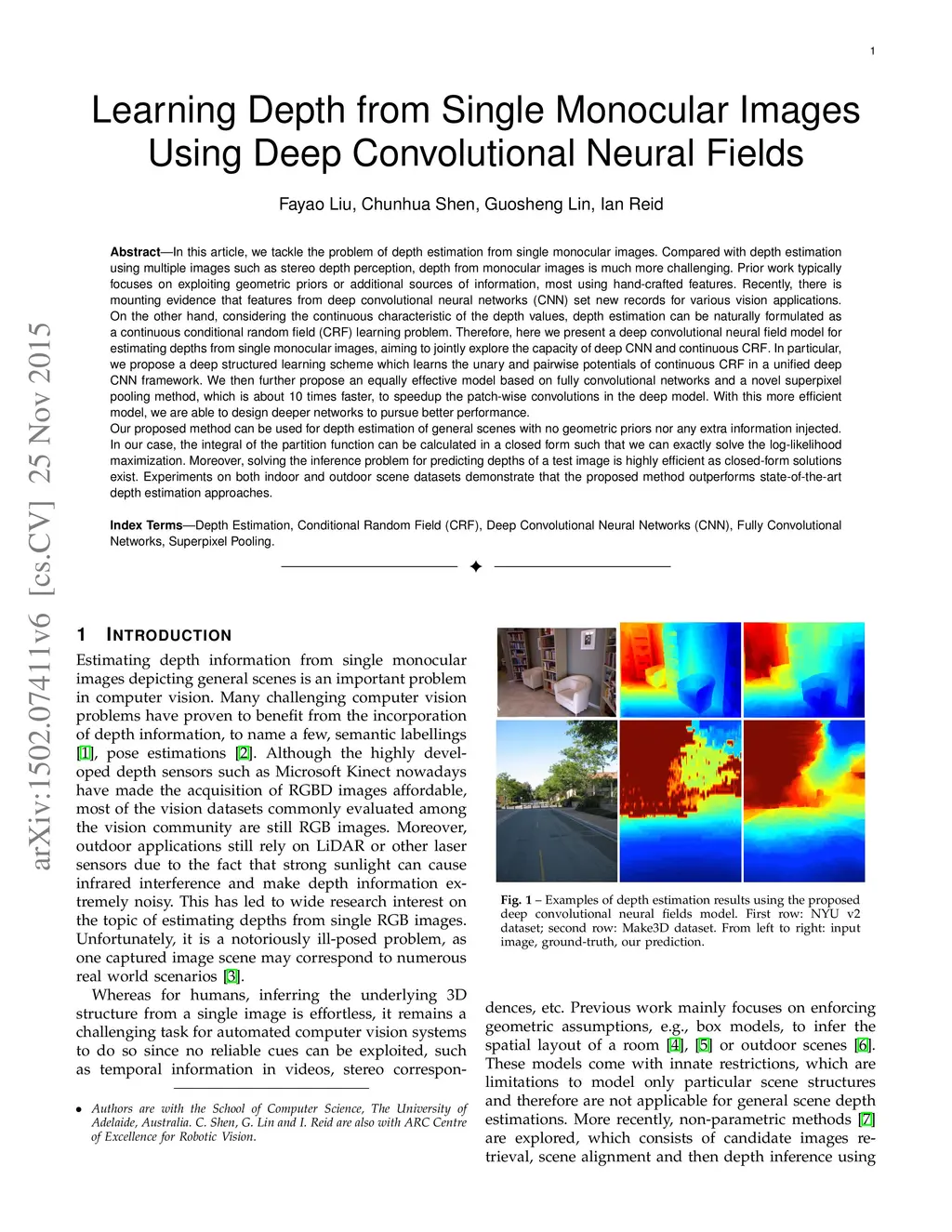 In this article, we tackle the problem of depth estimation from single monocular images. Compared with depth estimation using multiple images such as stereo depth perception, depth from monocular images is much more challenging. Prior work typically focuses on exploiting geometric priors or additional sources of information, most using hand-crafted features. Recently, there is mounting evidence that features from deep convolutional neural networks (CNN) set new records for various vision applications. On the other hand, considering the continuous characteristic of the depth values, depth estimations can be naturally formulated as a continuous conditional random field (CRF) learning problem. Therefore, here we present a deep convolutional neural field model for estimating depths from single monocular images, aiming to jointly explore the capacity of deep CNN and continuous CRF. In particular, we propose a deep structured learning scheme which learns the unary and pairwise potentials of continuous CRF in a unified deep CNN framework. We then further propose an equally effective model based on fully convolutional networks and a novel superpixel pooling method, which is times faster, to speedup the patch-wise convolutions in the deep model. With this more efficient model, we are able to design deeper networks to pursue better performance. Experiments on both indoor and outdoor scene datasets demonstrate that the proposed method outperforms state-of-the-art depth estimation approaches.