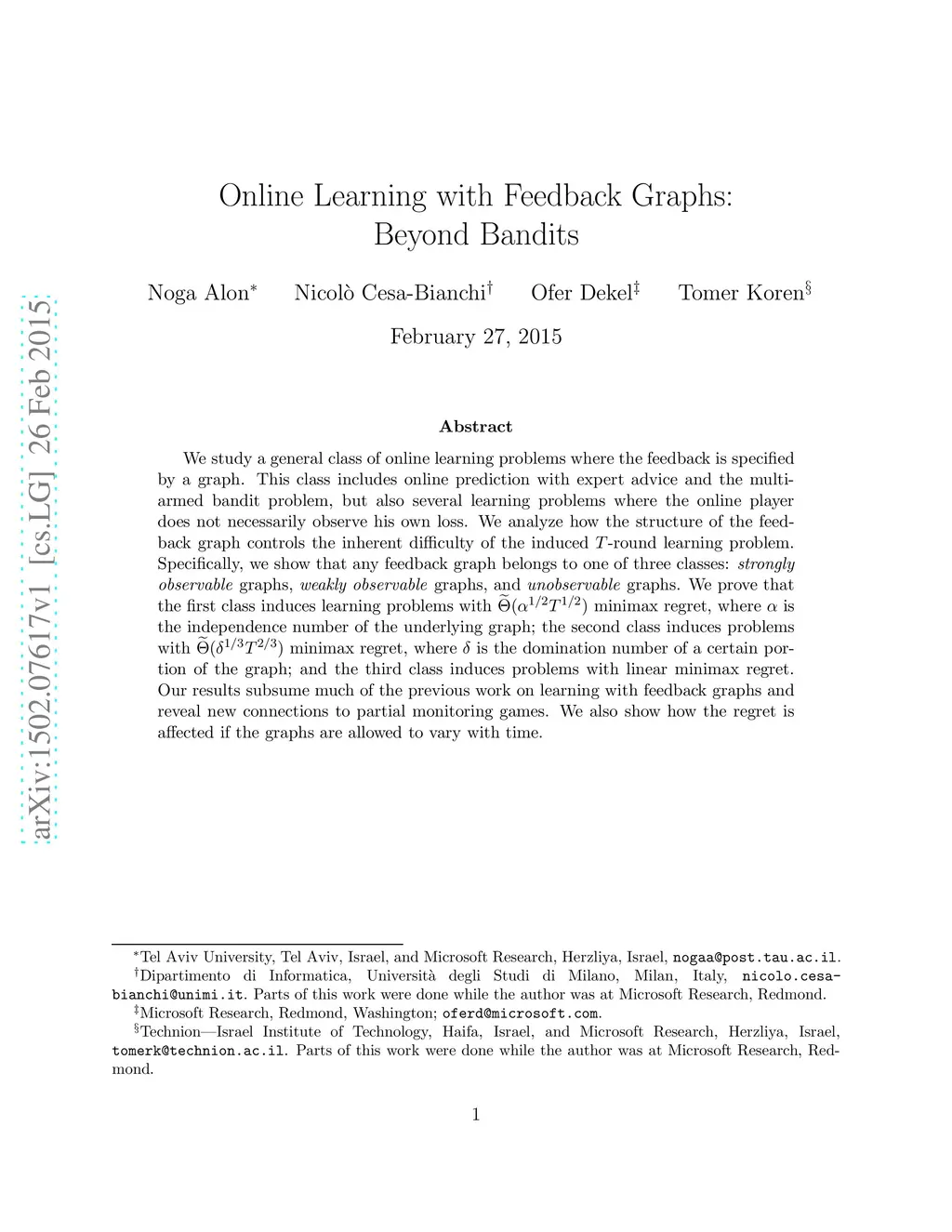 We study a general class of online learning problems where the feedback is specified by a graph. This class includes online prediction with expert advice and the multi-armed bandit problem, but also several learning problems where the online player does not necessarily observe his own loss. We analyze how the structure of the feedback graph controls the inherent difficulty of the induced -round learning problem. Specifically, we show that any feedback graph belongs to one of three classes: strongly observable graphs, weakly observable graphs, and unobservable graphs. We prove that the first class induces learning problems with minimax regret, where is the independence number of the underlying graph; the second class induces problems with minimax regret, where is the domination number of a certain portion of the graph; and the third class induces problems with linear minimax regret. Our results subsume much of the previous work on learning with feedback graphs and reveal new connections to partial monitoring games. We also show how the regret is affected if the graphs are allowed to vary with time.