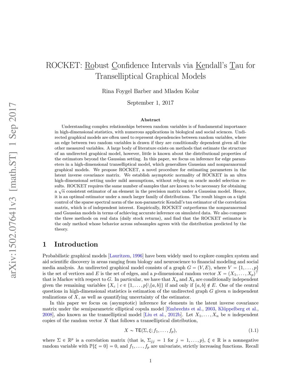 Undirected graphical models are used extensively in the biological and social sciences to encode a pattern of conditional independences between variables, where the absence of an edge between two nodes and indicates that the corresponding two variables and are believed to be conditionally independent, after controlling for all other measured variables. In the Gaussian case, conditional independence corresponds to a zero entry in the precision matrix (the inverse of the covariance matrix ). Real data often exhibits heavy tail dependence between variables, which cannot be captured by the commonly-used Gaussian or nonparanormal (Gaussian copula) graphical models. In this paper, we study the transelliptical model, an elliptical copula model that generalizes Gaussian and nonparanormal models to a broader family of distributions. We propose the ROCKET method, which constructs an estimator of that we prove to be asymptotically normal under mild assumptions. Empirically, ROCKET outperforms the nonparanormal and Gaussian models in terms of achieving accurate inference on simulated data. We also compare the three methods on real data (daily stock returns), and find that the ROCKET estimator is the only method whose behavior across subsamples agrees with the distribution predicted by the theory.