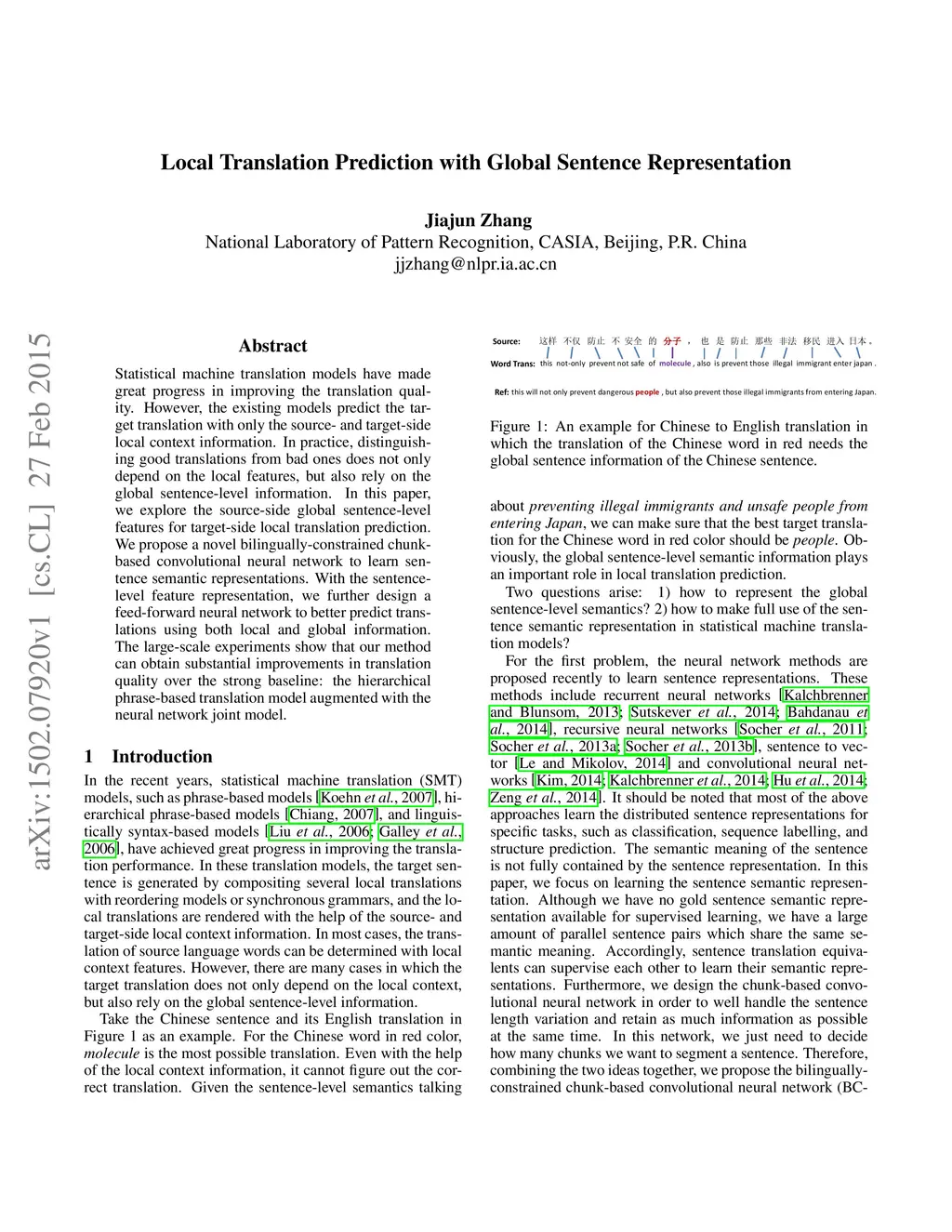 Statistical machine translation models have made great progress in improving the translation quality. However, the existing models predict the target translation with only the source- and target-side local context information. In practice, distinguishing good translations from bad ones does not only depend on the local features, but also rely on the global sentence-level information. In this paper, we explore the source-side global sentence-level features for target-side local translation prediction. We propose a novel bilingually-constrained chunk-based convolutional neural network to learn sentence semantic representations. With the sentence-level feature representation, we further design a feed-forward neural network to better predict translations using both local and global information. The large-scale experiments show that our method can obtain substantial improvements in translation quality over the strong baseline: the hierarchical phrase-based translation model augmented with the neural network joint model.