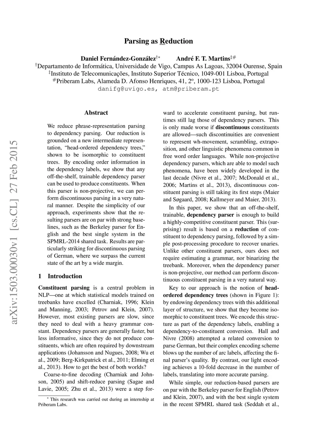 We reduce phrase-representation parsing to dependency parsing. Our reduction is grounded on a new intermediate representation, "head-ordered dependency trees", shown to be isomorphic to constituent trees. By encoding order information in the dependency labels, we show that any off-the-shelf, trainable dependency parser can be used to produce constituents. When this parser is non-projective, we can perform discontinuous parsing in a very natural manner. Despite the simplicity of our approach, experiments show that the resulting parsers are on par with strong baselines, such as the Berkeley parser for English and the best single system in the SPMRL-2014 shared task. Results are particularly striking for discontinuous parsing of German, where we surpass the current state of the art by a wide margin.