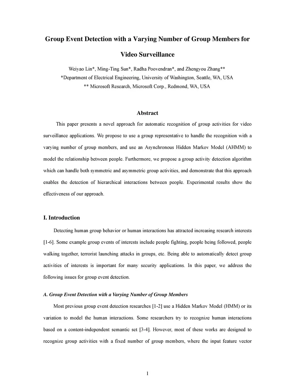 This paper presents a novel approach for automatic recognition of group activities for video surveillance applications. We propose to use a group representative to handle the recognition with a varying number of group members, and use an Asynchronous Hidden Markov Model (AHMM) to model the relationship between people. Furthermore, we propose a group activity detection algorithm which can handle both symmetric and asymmetric group activities, and demonstrate that this approach enables the detection of hierarchical interactions between people. Experimental results show the effectiveness of our approach.