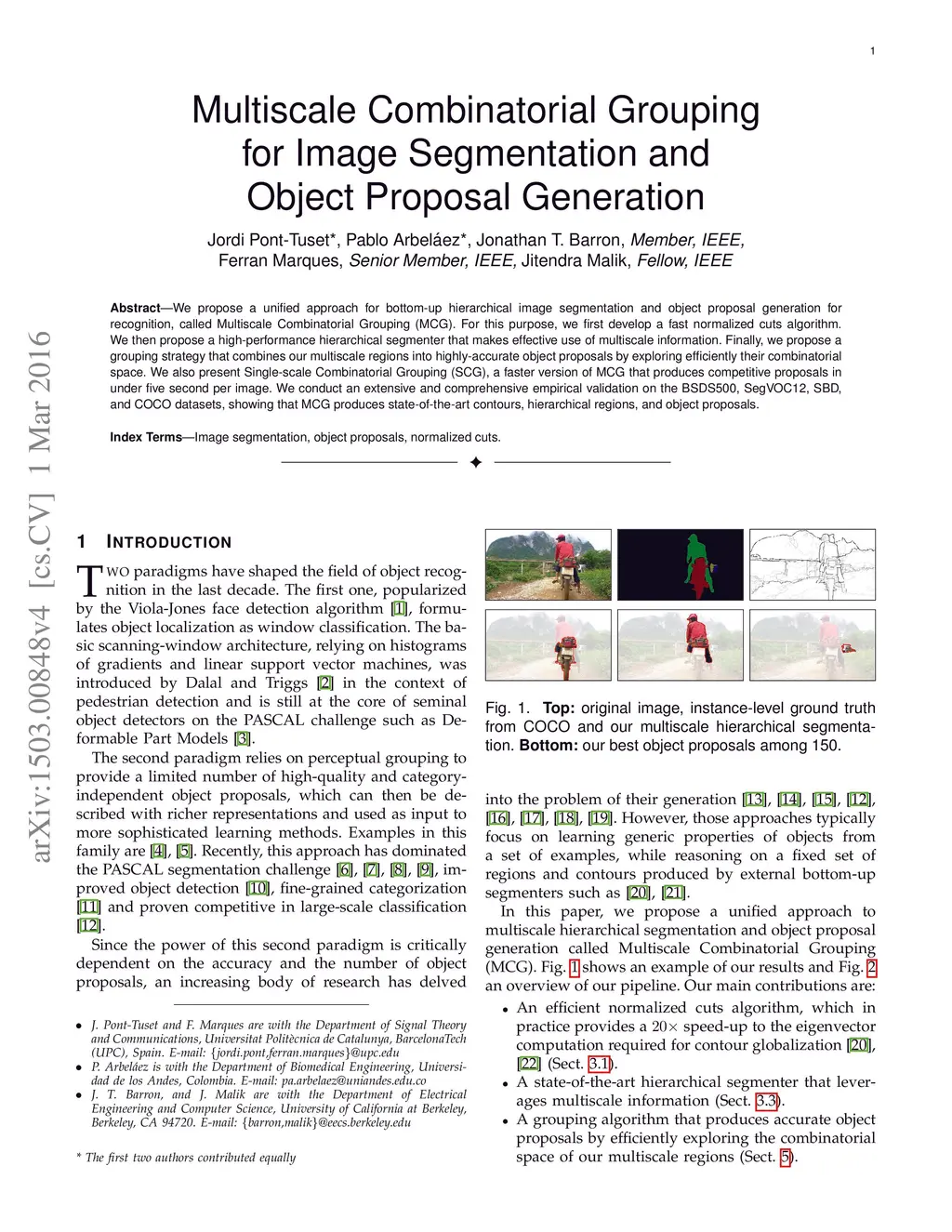 We propose a unified approach for bottom-up hierarchical image segmentation and object proposal generation for recognition, called Multiscale Combinatorial Grouping (MCG). For this purpose, we first develop a fast normalized cuts algorithm. We then propose a high-performance hierarchical segmenter that makes effective use of multiscale information. Finally, we propose a grouping strategy that combines our multiscale regions into highly-accurate object proposals by exploring efficiently their combinatorial space. We also present Single-scale Combinatorial Grouping (SCG), a faster version of MCG that produces competitive proposals in under five second per image. We conduct an extensive and comprehensive empirical validation on the BSDS500, SegVOC12, SBD, and COCO datasets, showing that MCG produces state-of-the-art contours, hierarchical regions, and object proposals.