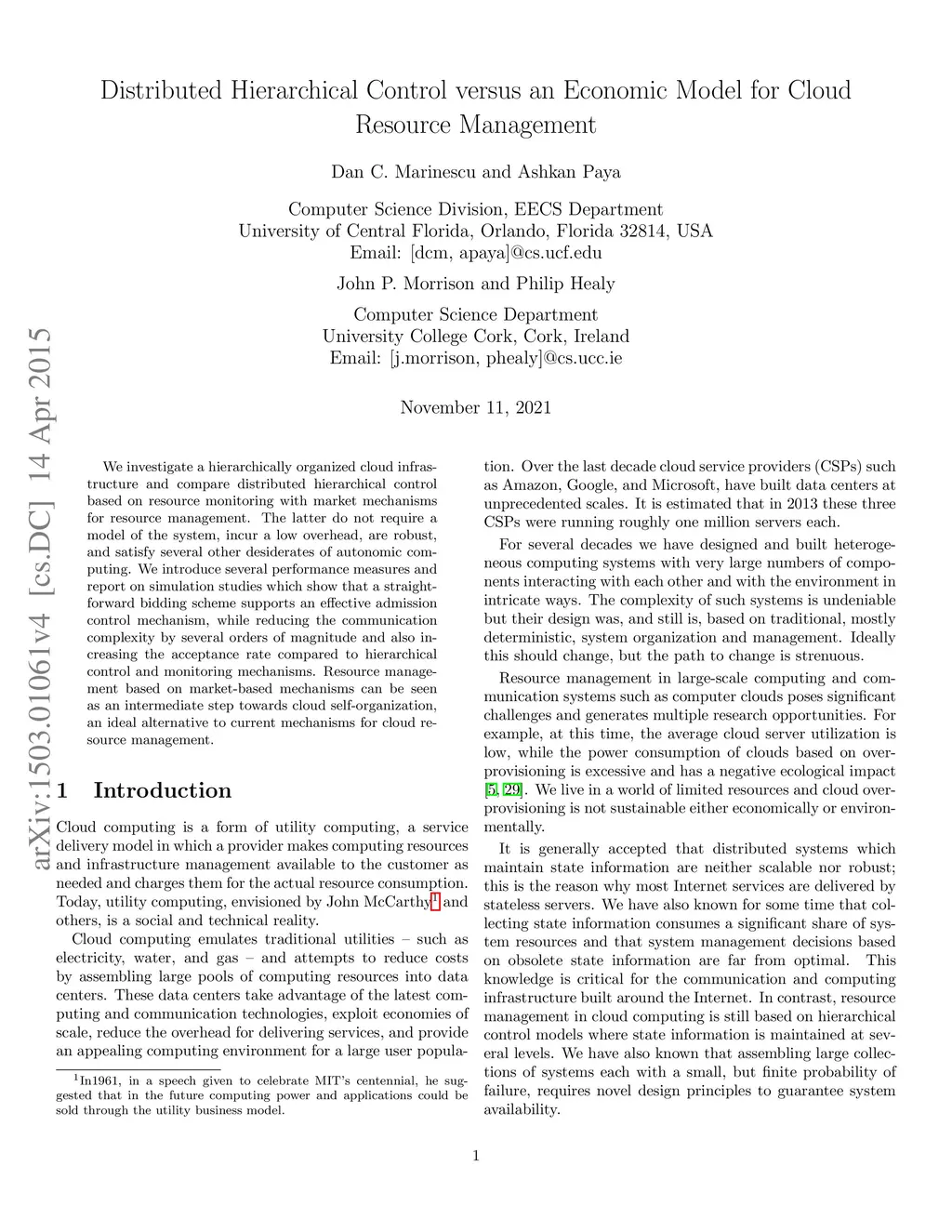 Distributed Hierarchical Control versus an Economic Model for Cloud