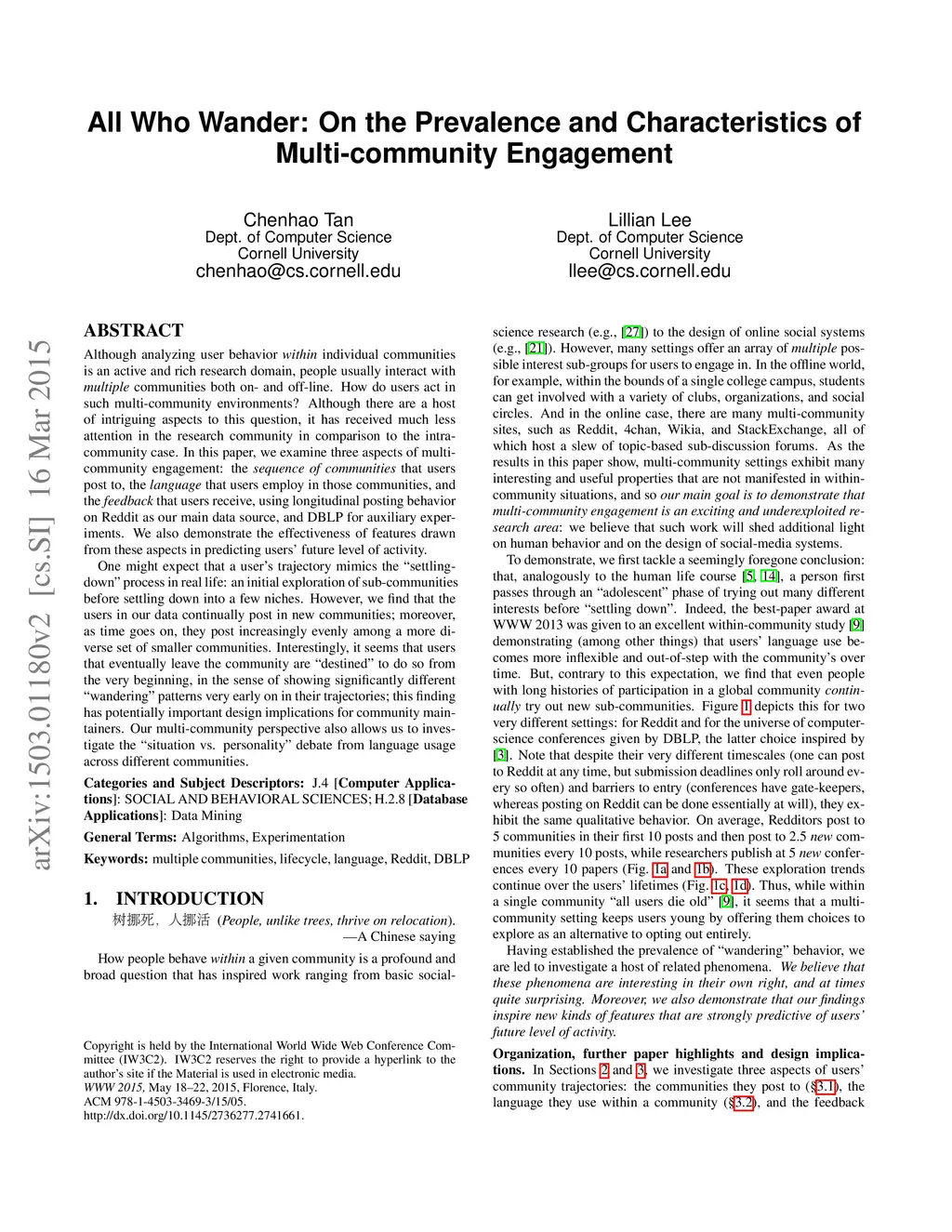 Although analyzing user behavior within individual communities is an active and rich research domain, people usually interact with multiple communities both on- and off-line. How do users act in such multi-community environments? Although there are a host of intriguing aspects to this question, it has received much less attention in the research community in comparison to the intra-community case. In this paper, we examine three aspects of multi-community engagement: the sequence of communities that users post to, the language that users employ in those communities, and the feedback that users receive, using longitudinal posting behavior on Reddit as our main data source, and DBLP for auxiliary experiments. We also demonstrate the effectiveness of features drawn from these aspects in predicting users' future level of activity. One might expect that a user's trajectory mimics the "settling-down" process in real life: an initial exploration of sub-communities before settling down into a few niches. However, we find that the users in our data continually post in new communities; moreover, as time goes on, they post increasingly evenly among a more diverse set of smaller communities. Interestingly, it seems that users that eventually leave the community are "destined" to do so from the very beginning, in the sense of showing significantly different "wandering" patterns very early on in their trajectories; this finding has potentially important design implications for community maintainers. Our multi-community perspective also allows us to investigate the "situation vs. personality" debate from language usage across different communities.