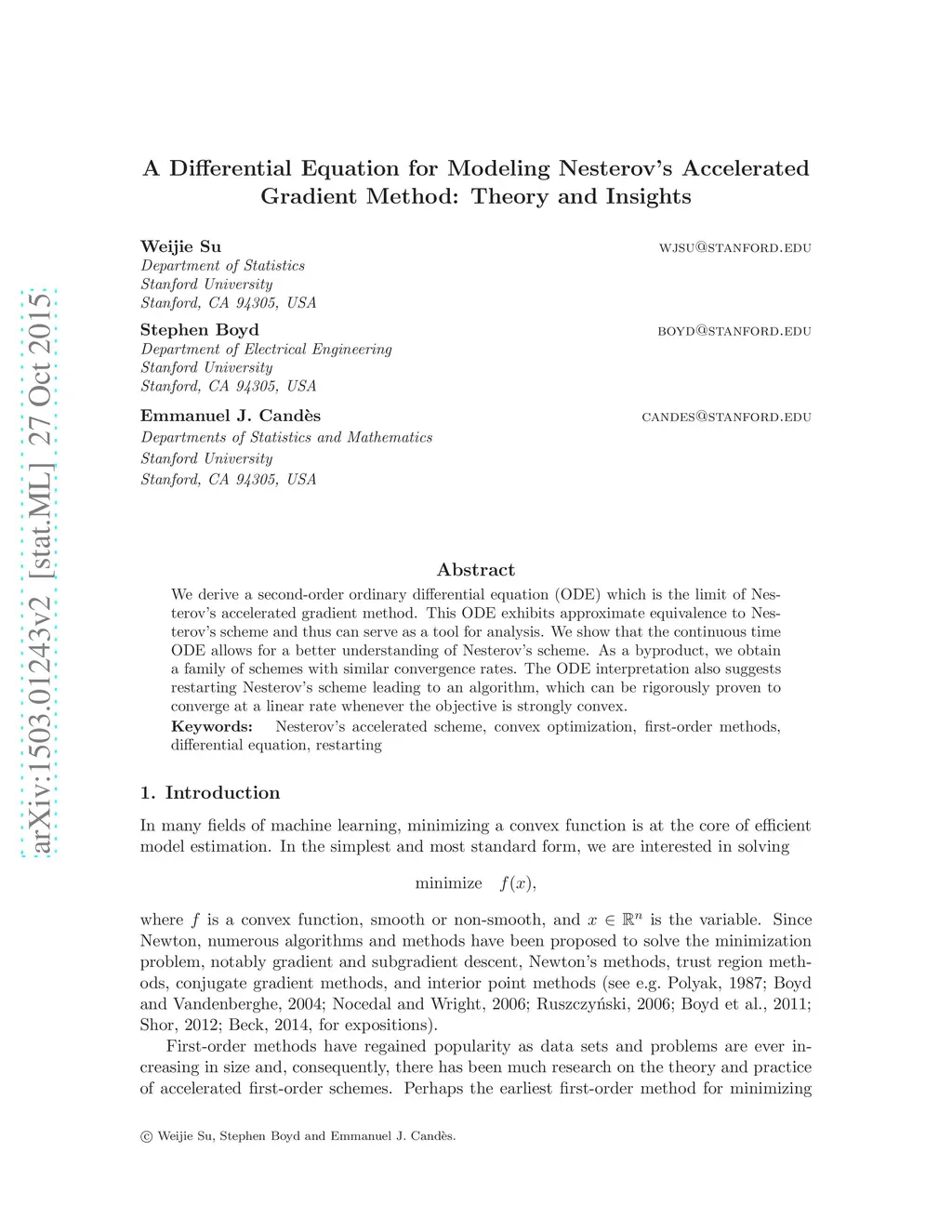 We derive a second-order ordinary differential equation (ODE) which is the limit of Nesterov's accelerated gradient method. This ODE exhibits approximate equivalence to Nesterov's scheme and thus can serve as a tool for analysis. We show that the continuous time ODE allows for a better understanding of Nesterov's scheme. As a byproduct, we obtain a family of schemes with similar convergence rates. The ODE interpretation also suggests restarting Nesterov's scheme leading to an algorithm, which can be rigorously proven to converge at a linear rate whenever the objective is strongly convex.