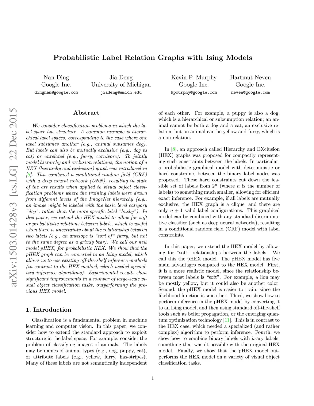 We consider classification problems in which the label space has structure. A common example is hierarchical label spaces, corresponding to the case where one label subsumes another (e.g., animal subsumes dog). But labels can also be mutually exclusive (e.g., dog vs cat) or unrelated (e.g., furry, carnivore). To jointly model hierarchy and exclusion relations, the notion of a HEX (hierarchy and exclusion) graph was introduced in [7]. This combined a conditional random field (CRF) with a deep neural network (DNN), resulting in state of the art results when applied to visual object classification problems where the training labels were drawn from different levels of the ImageNet hierarchy (e.g., an image might be labeled with the basic level category "dog", rather than the more specific label "husky"). In this paper, we extend the HEX model to allow for soft or probabilistic relations between labels, which is useful when there is uncertainty about the relationship between two labels (e.g., an antelope is "sort of" furry, but not to the same degree as a grizzly bear). We call our new model pHEX, for probabilistic HEX. We show that the pHEX graph can be converted to an Ising model, which allows us to use existing off-the-shelf inference methods (in contrast to the HEX method, which needed specialized inference algorithms). Experimental results show significant improvements in a number of large-scale visual object classification tasks, outperforming the previous HEX model.