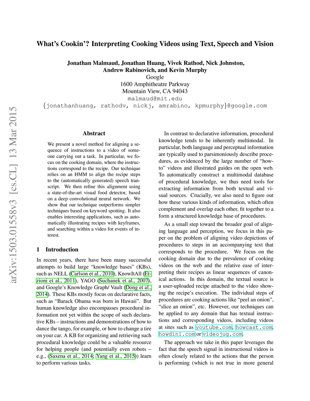 What's Cookin'? Interpreting Cooking Videos using Text, Speech and