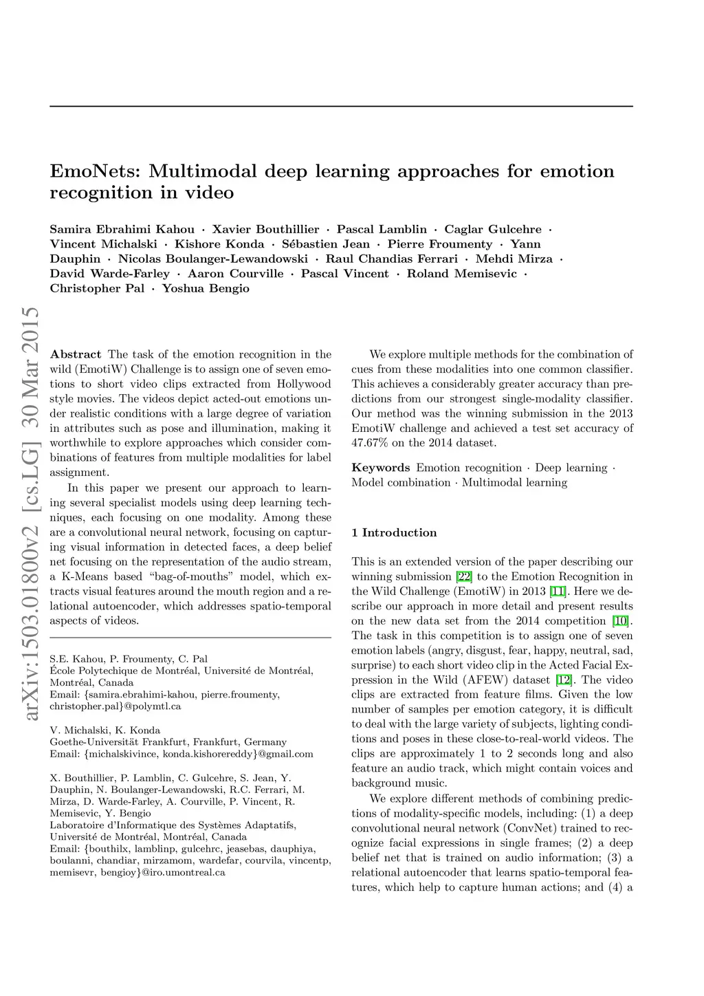 EmoNets: Multimodal deep learning approaches for emotion recognition in